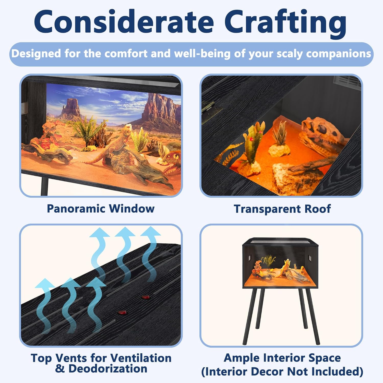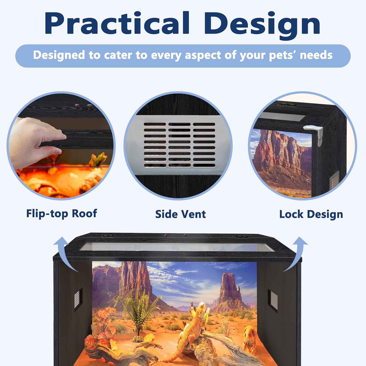 - 【Comfortable Habitat】Provide your reptiles with a spacious, secure, and comfortable home. This enclosure features a front acrylic panel for ultra-clear visibility, allowing you to observe your pets in their natural environment. Equipped with top and side ventilation, it ensures excellent airflow to keep your reptiles healthy. This wood habitat also represents greater heat retention than normal glass and mesh tank, which is good for your pets like lizard, gecko and snakes! Important Note: This habitat is not designed to hold water.