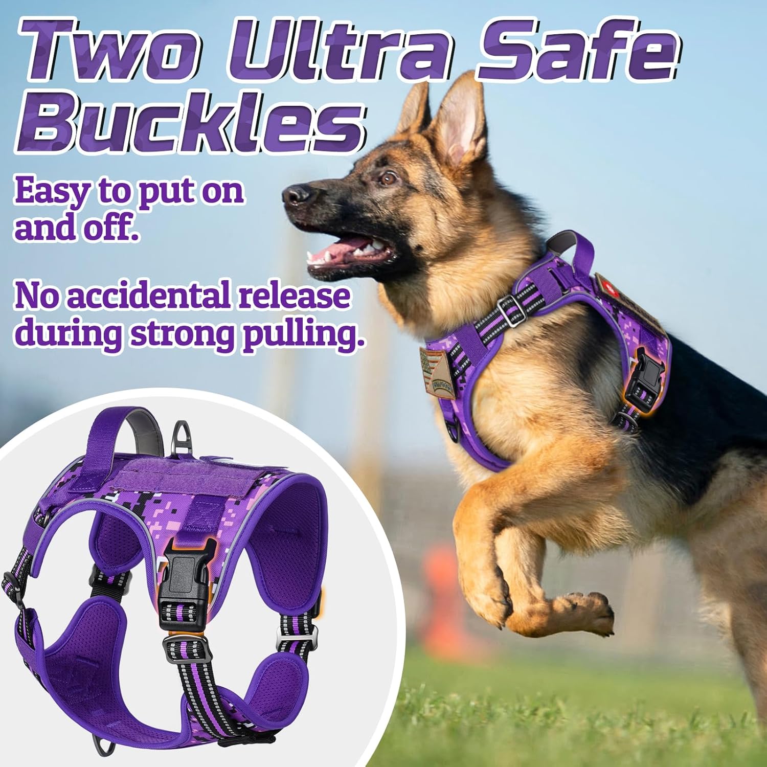 - Easy to Adjust & Wear: The tactical dog harness features 4 convenient adjustment points (2 Shoulder, 2 Chest) to ensure a snug fit for dogs of all sizes. Two quick-release buckles are designed not only for easy on and off, but also can withstand great pulling force, providing security for training, hunting, walking, and any other occasions