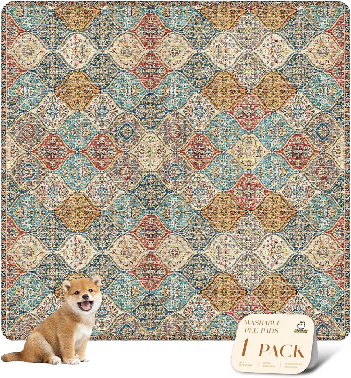 nunubaby Washable Pee Pads for Dogs, Stylish, Non-Slip and Leak-Proof Pee Pads. Reusable Potty Pads for Dogs for Crates and Floors.(Cream/Multi, 72" x72" )