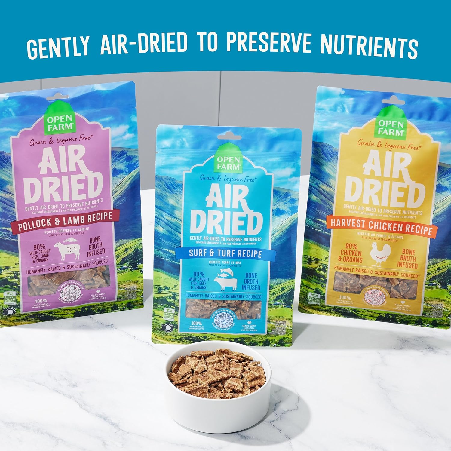 Open Farm, Air Dried Dog Food Infused with Bone Broth, Grain & Legume Free, Complete Meal or Food Topper, Surf & Turf Recipe, 1lb Bag