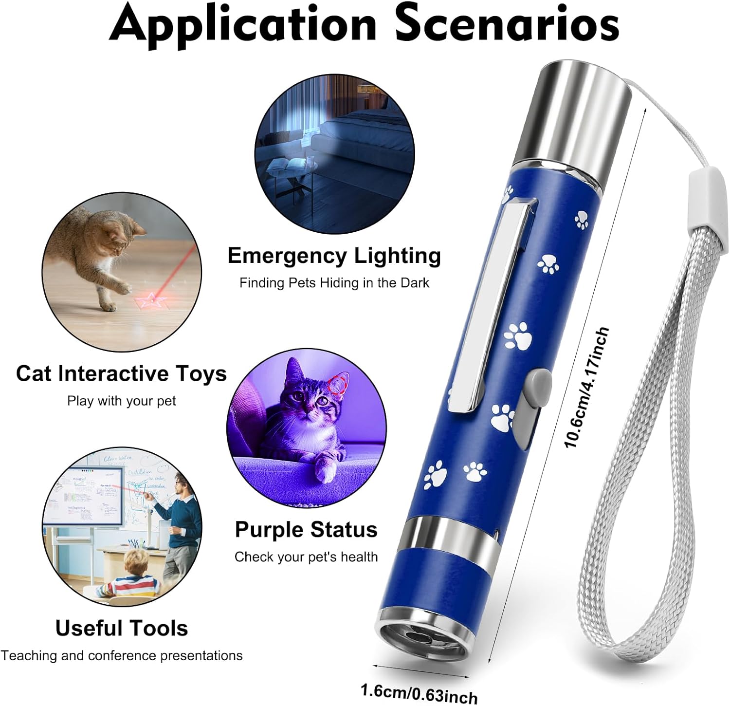 - Multi-Mode Interactive Toy: The cat toy has three modes: red, purple, and white. The red mode is suitable for playing and chasing with your pet, training your cat or dog's reaction and agility during the game. The violet mode is not only for detecting counterfeit bills, but also suitable for Observing your pet's health status. The white mode designed for emergency lighting at night is convenient for users to use it safely even in dark environment