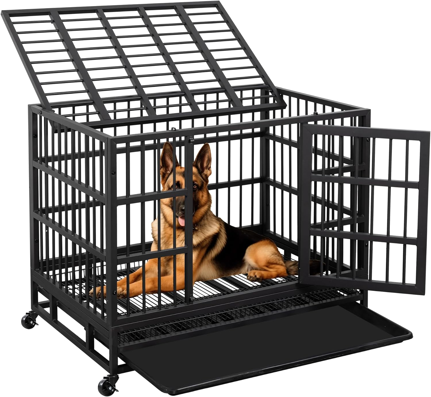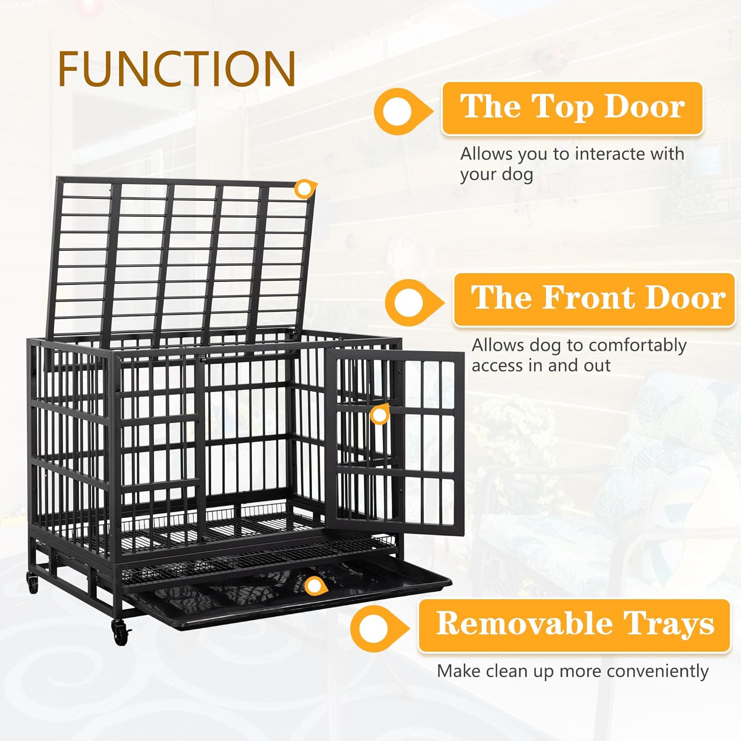 JY QAQA 38 Inch Heavy Duty Indestructible Dog Crate Double Doors Escape Proof Cage Kennel,Enhanced Metal Pet Cage,Extra Large XL XXL Crate Indoor for Large Dog with Removable Tray and Lockable Wheels