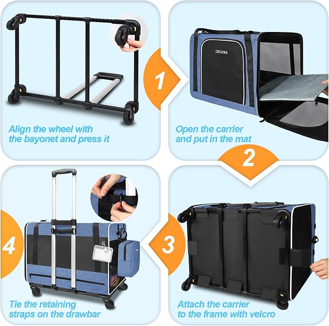 - 【SMOOTH AS PULLING A SUITCASE】The cat carrier with wheels' bar designed like a suitcase, you can not only use the double cat carrier like a suitcase, but also as a shoulder bag and a handbag. And the 4 high-quality wheels with 360° rotation can ensure a smooth and comfortable riding experience for the rolling cat carrier on uneven road surfaces or grass.