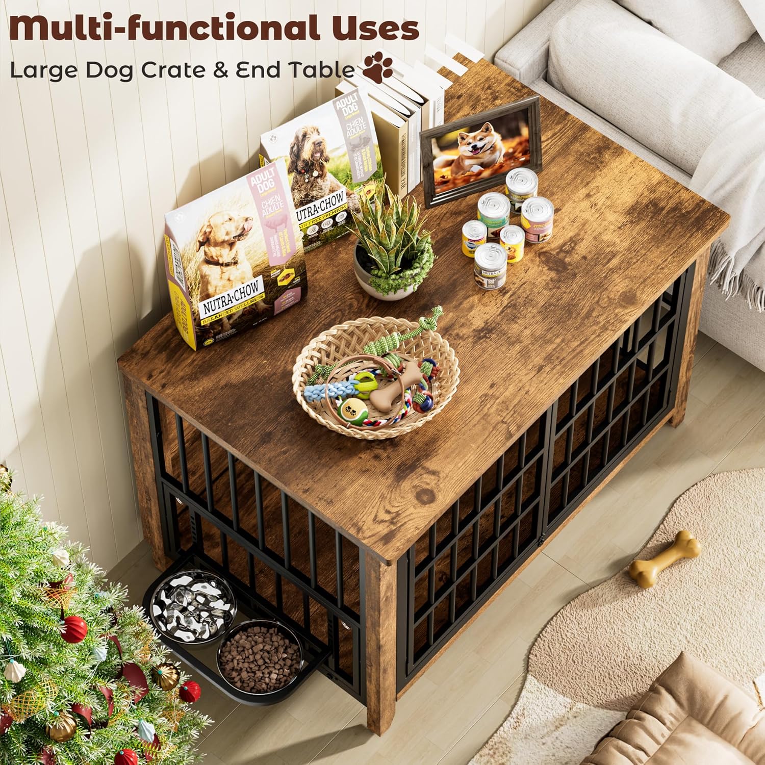 Lulive Wooden Dog Crate Furniture, Large Dog Kennel Indoor with 360°& Adjustable Raised Dog Bowls, Double Doors Furniture Dog Crates End Table for Large/Medium Dogs 37.8" L*23.6" W*27" H, Brown
