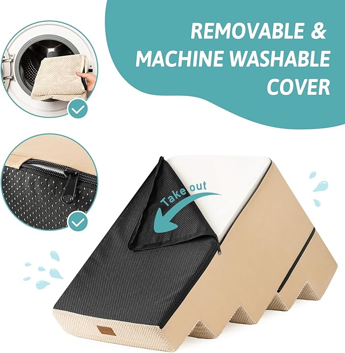 - Non-Slip Base and Removable Cover: Our dog steps for beds are equipped with a non-slip base featuring rubber dots for extra grip, minimizing movement during use. The pet steps cover is waterproof on the inner side, so you don’t have to worry about stains seeping into the foam. The outer cover is removable and machine washable for easy cleaning