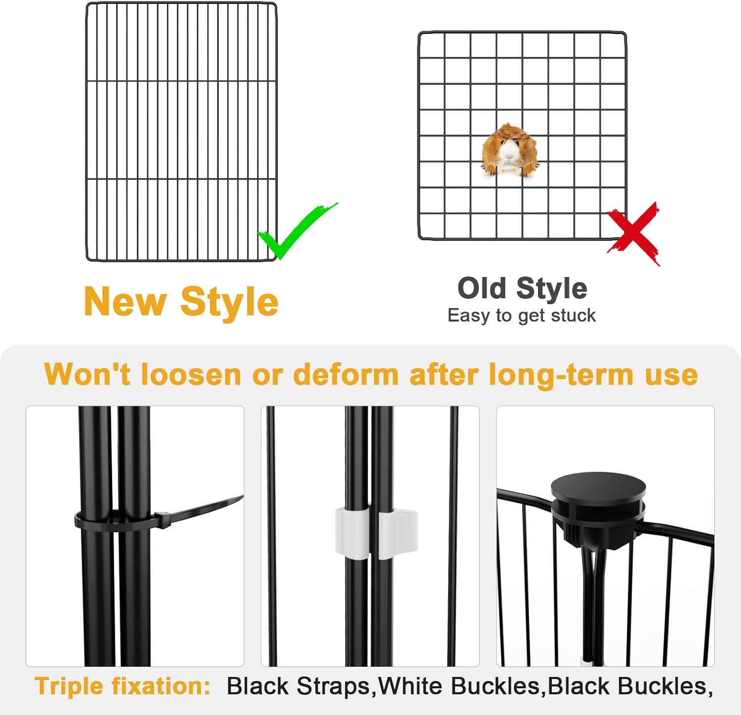 - Triple Reinforcement to Prevent Loosening: Black buckles, white buckles, and black straps are all used to connect each panel. Different accessories provide stability from the bottom to the top of the guinea pig enclosure. The installation method is very simple, a 5-year-old kid can operate it (with instructions included). 50 black straps can be reused in areas you think need reinforcement.