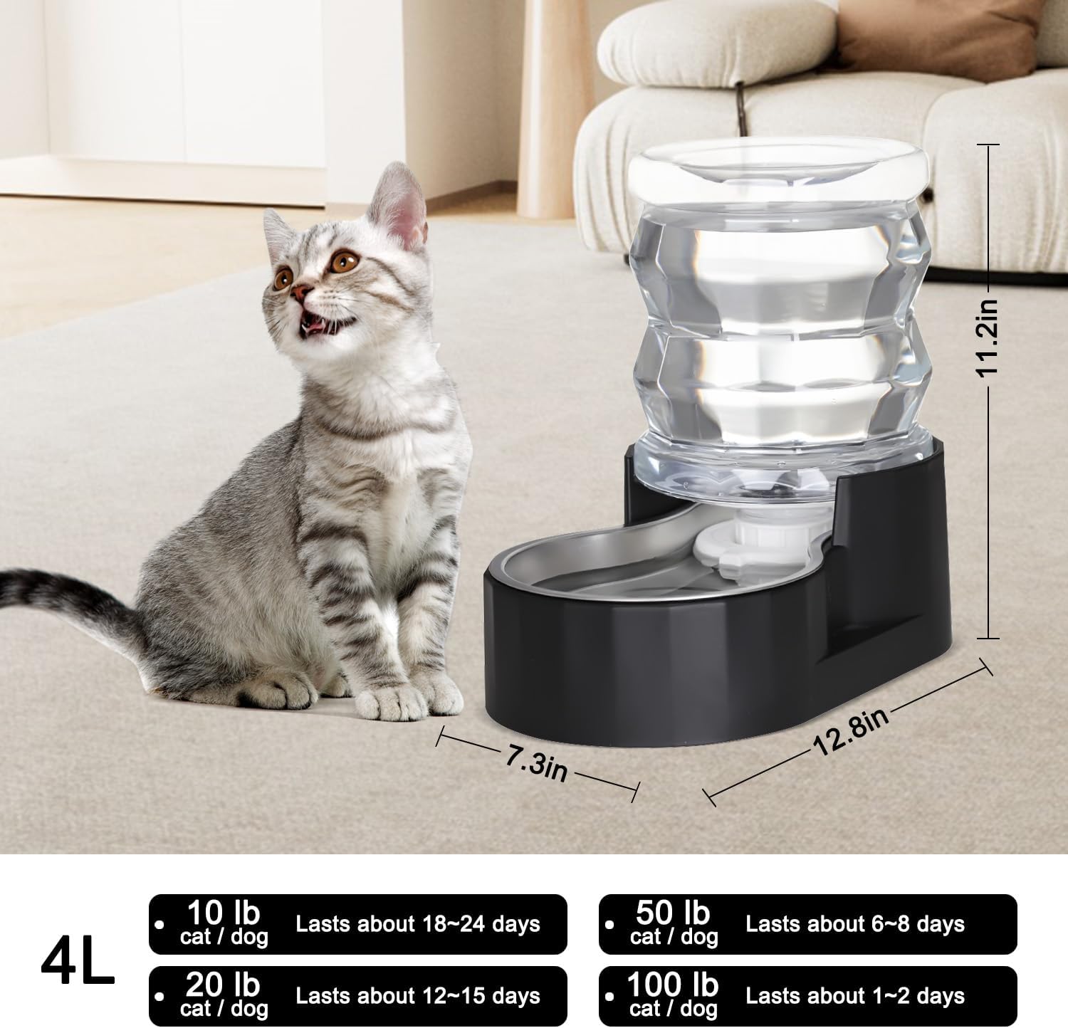 - Large Capacity:Tailored for kittens, this water dispenser utilizes gravity to slowly fill the bottle with water, effectively extending the filling cycle and ensuring that the 4-liter capacity is sufficient to meet the kitten's daily drinking needs. Whether the pet owner is traveling or busy at work, you can rest assured that your pet's drinking problem can be solved.