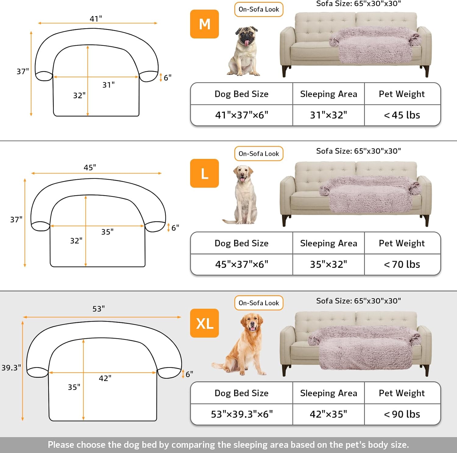 - 【Multiple Size Selection】The couch pet bed has 5 sizes for you to choose from. M: 41"x37" dog bed for medium dogs. L: 45"x37" dog bed for large dogs. XL: 53"x39.3" dog bed for large dogs. We have enlarged the sleeping area for pets to give dogs more space.