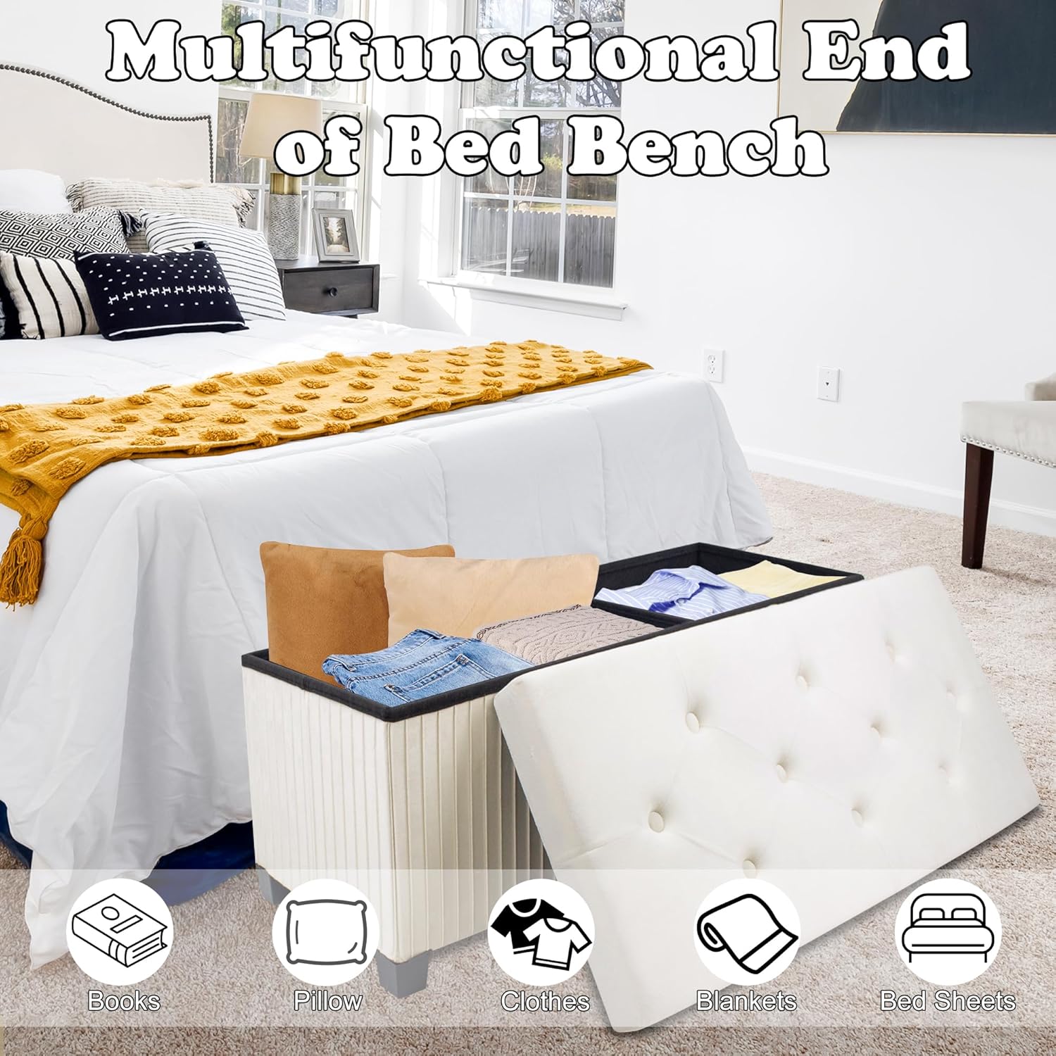 Storage Ottoman Bench, 43 Inch Foldable Ottoman with Legs, Velvet Foot Rest Stool, End of Bed Bench, Storage Chest for Living Room, Bedroom (Beige)