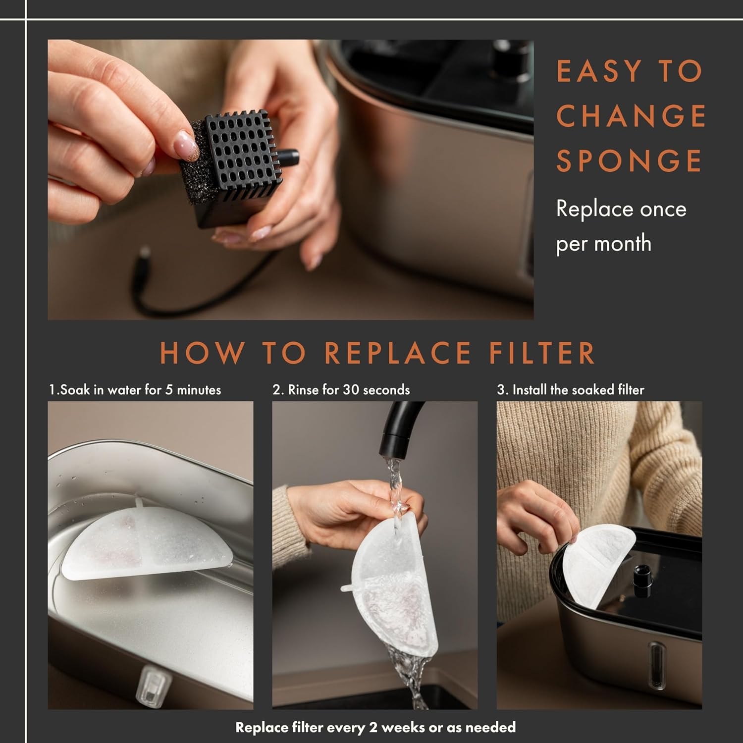 - [Extends Fountain & Pump Lifespan ] – Helps prevent hair, debris, and food particles from clogging the pump, ensuring smooth operation and extending the life of your pet water fountain.