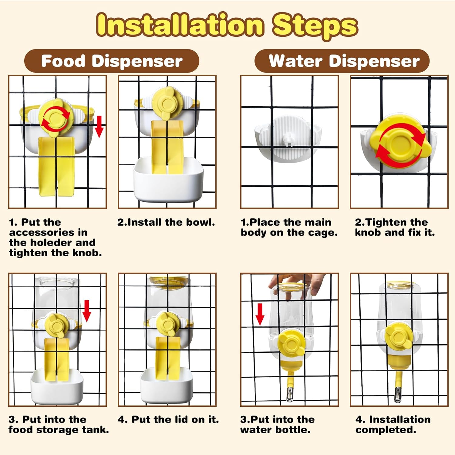 - Easy to install: just rotate the buttons and it can be easily installed inside and outside of the cage, no other tools needed, the connection is corrugated for more solidity.