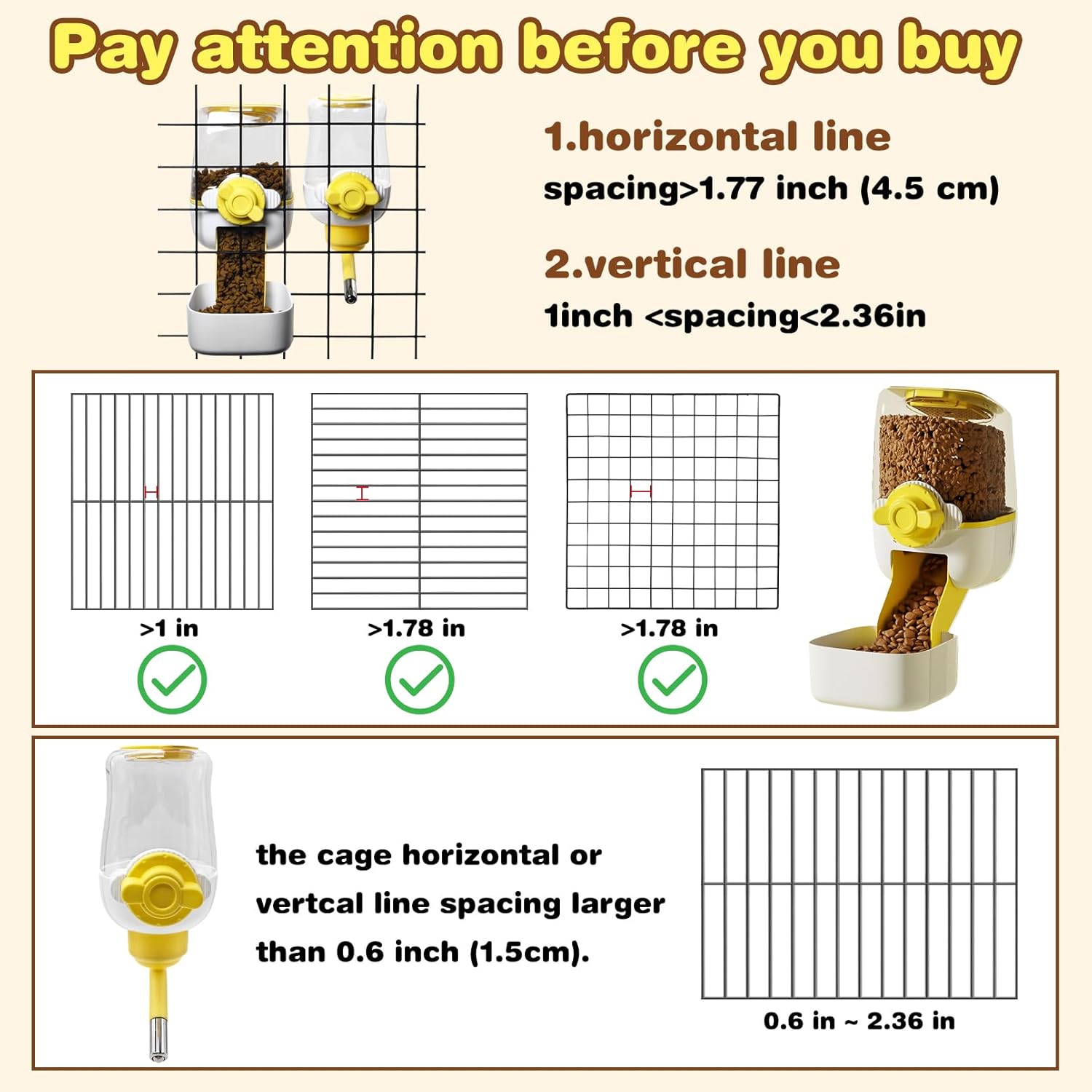 - Tips: the recommended cage net spacing is 2.5-6cm(1-2.36 inch), please measure the cage net spacing carefully before purchase and make sure it can be used, if the spacing is less than 1 inch, you can try to bend the kennel wire bars a little bit