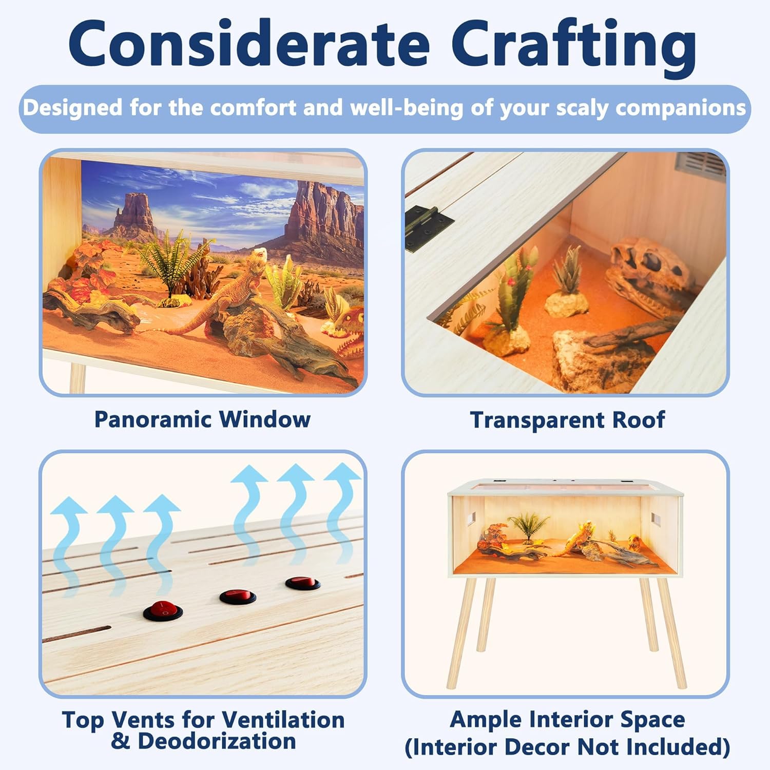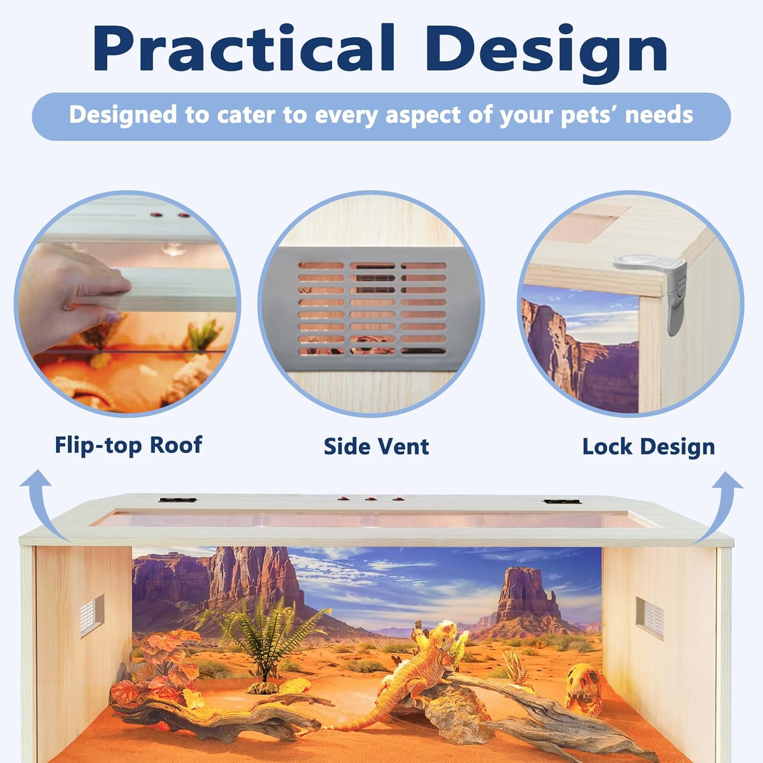 - 【Comfortable Habitat】Provide your reptiles with a spacious, secure, and comfortable home. This enclosure features a front acrylic panel for ultra-clear visibility, allowing you to observe your pets in their natural environment. Equipped with top and side ventilation, it ensures excellent airflow to keep your reptiles healthy. This wood habitat also represents greater heat retention than normal glass and mesh tank, which is good for your pets like lizard, gecko and snakes! Important Note: This habitat is not designed to hold water.