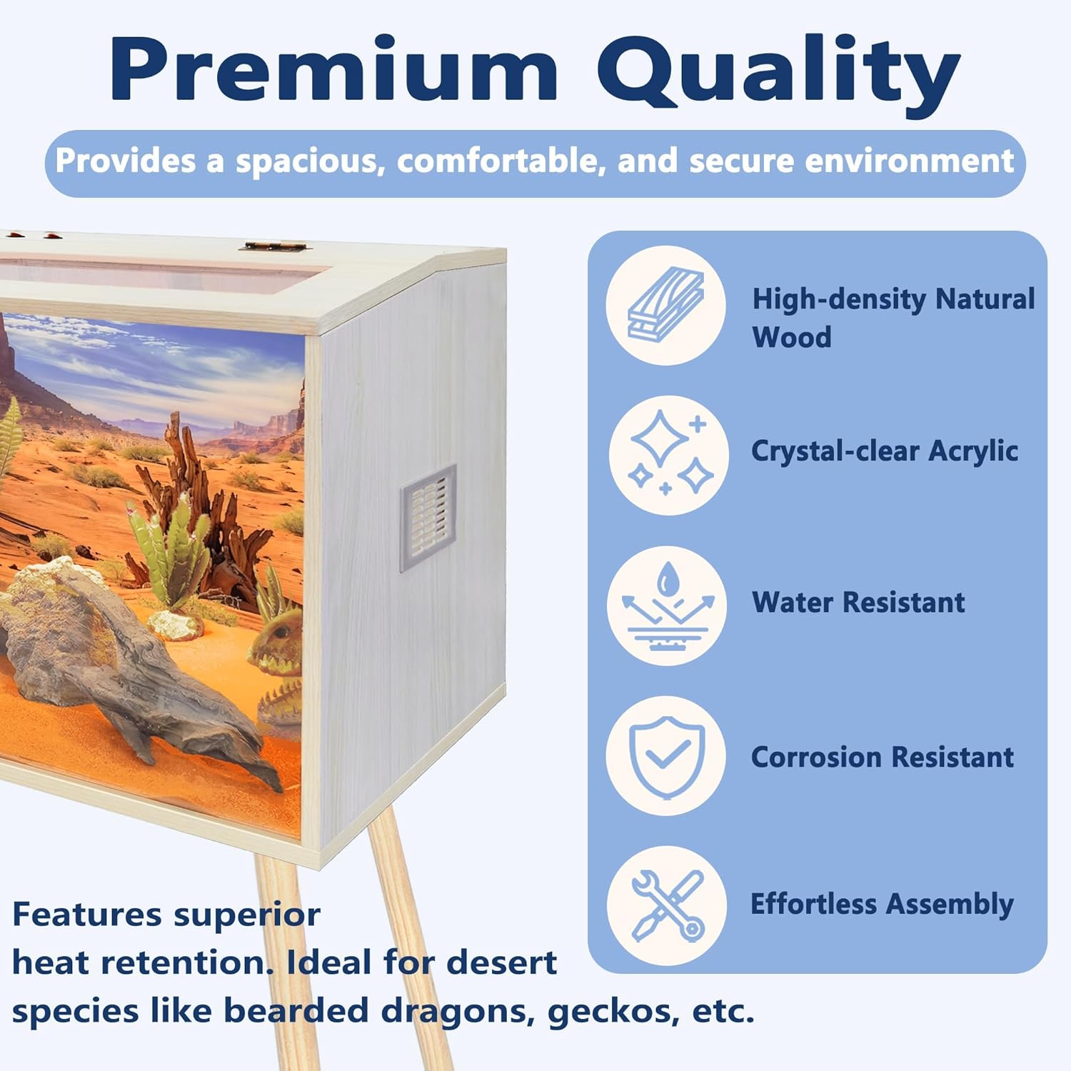 - 【Superior Craftsmanship】Built with high-density, pet-safe solid wood core and durable acrylic, this habitat offers long-lasting performance and a sophisticated look. The wood is coated for waterproofing and corrosion resistance. A waterproof acrylic bottom panel provides extra protection against spills or accidents. Available in four sizes (24–48 inches in length and 40 or 47.5 inches in overall height), this enclosure is designed to fit a variety of reptile needs. Refer to the image 2 for detailed dimensions.