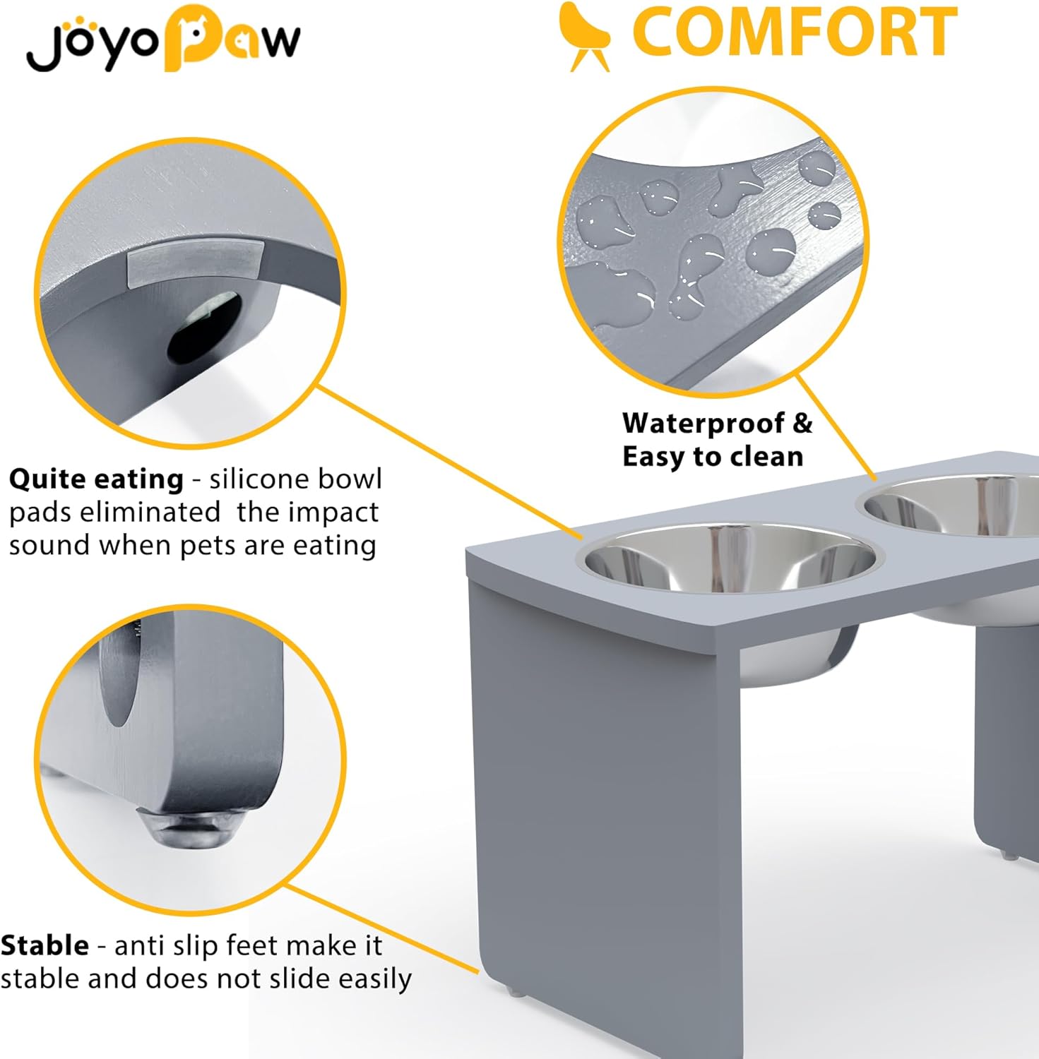 - IMPROVE HEALTH STATUS? JoyoPaw bamboo dog food stand provide ease of access to food and water which help to reduce bloating and neck strain in dogs. Encourage effective digestion and avoid joint pressure to protect your adorable friend.