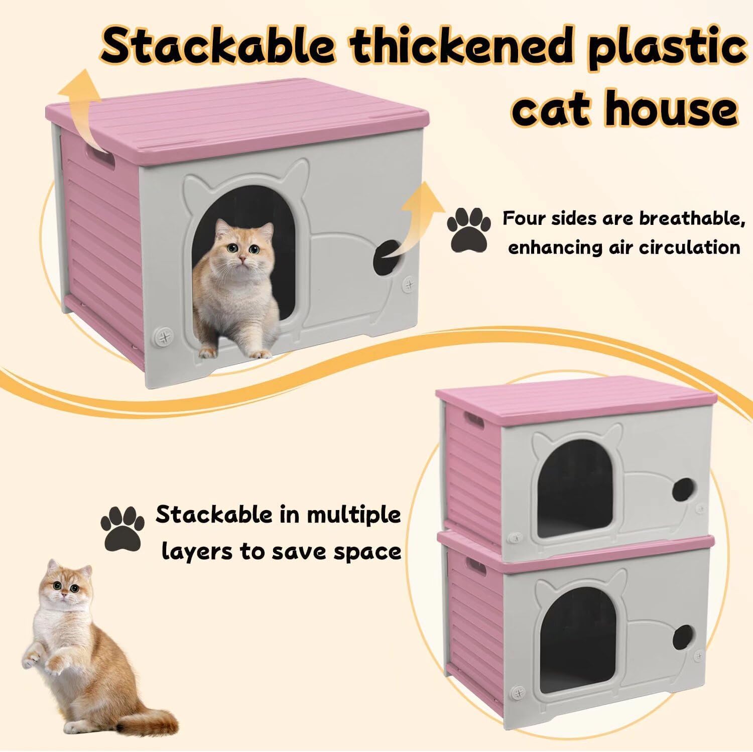 - COMFORT AND SAFETY: Our plastic cat houses are crafted to be both cozy and spacious, giving your cats plenty of room to enter and stretch out comfortably. The removable top promotes air circulation, ensuring the interior remains fresh and well-ventilated.