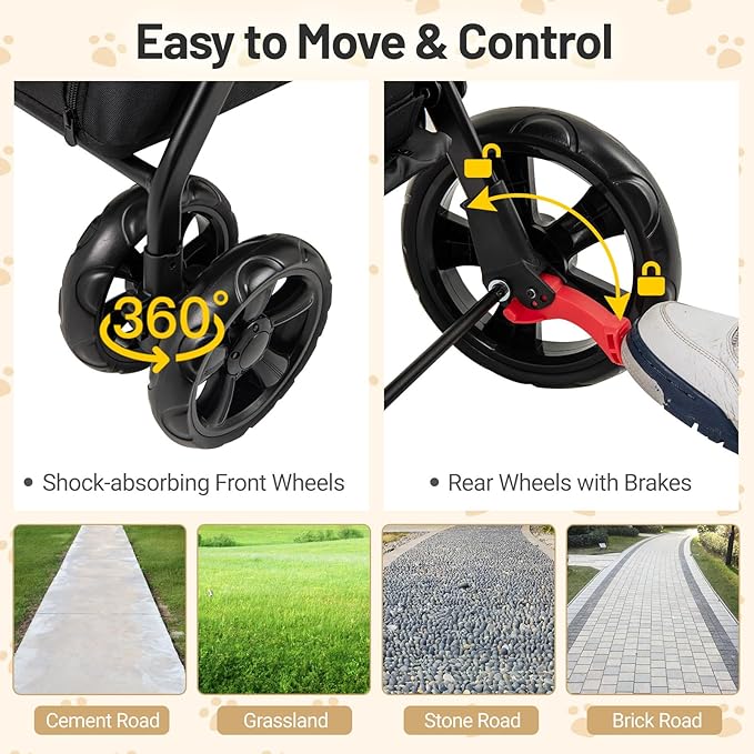 - Easy to Move & Control: The foldable cat stroller features shock-absorbing front wheels and rear wheels with single-foot brakes, providing a secure and smooth ride across different surfaces, including cement road, grassland, stone road and brick road. Also, a comfortably padded handle makes maneuvering easy.