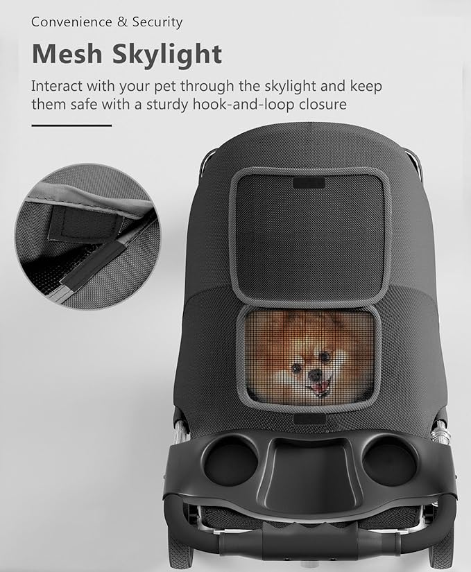 - [Humanized Design] - With convenient features like swivel front wheels, cup holders, and a hooded peak-top window, this pet stroller makes taking your pet out for exercise and fresh air an easy and enjoyable experience. The roomy design and undercarriage storage basket give you plenty of space to carry your essentials, too.