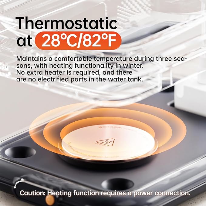 - Thermostatic Heating at 28°C/82℉ – Maintains water at a consistent 28°C/82℉ to keep pets hydrated in cooler weather. Heating function requires power connection. No electrified parts in the water tank for safety.