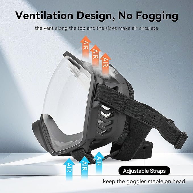 - Adjustable nylon strap allows you to adjust dog goggles according to the size of the dog without giving the dog a sense of restraint. Compared to other dog sunglasses, our products are designed with larger and more ventilation holes, it can better reduce the generation of steam and fog, offering further protect the safety of the dog