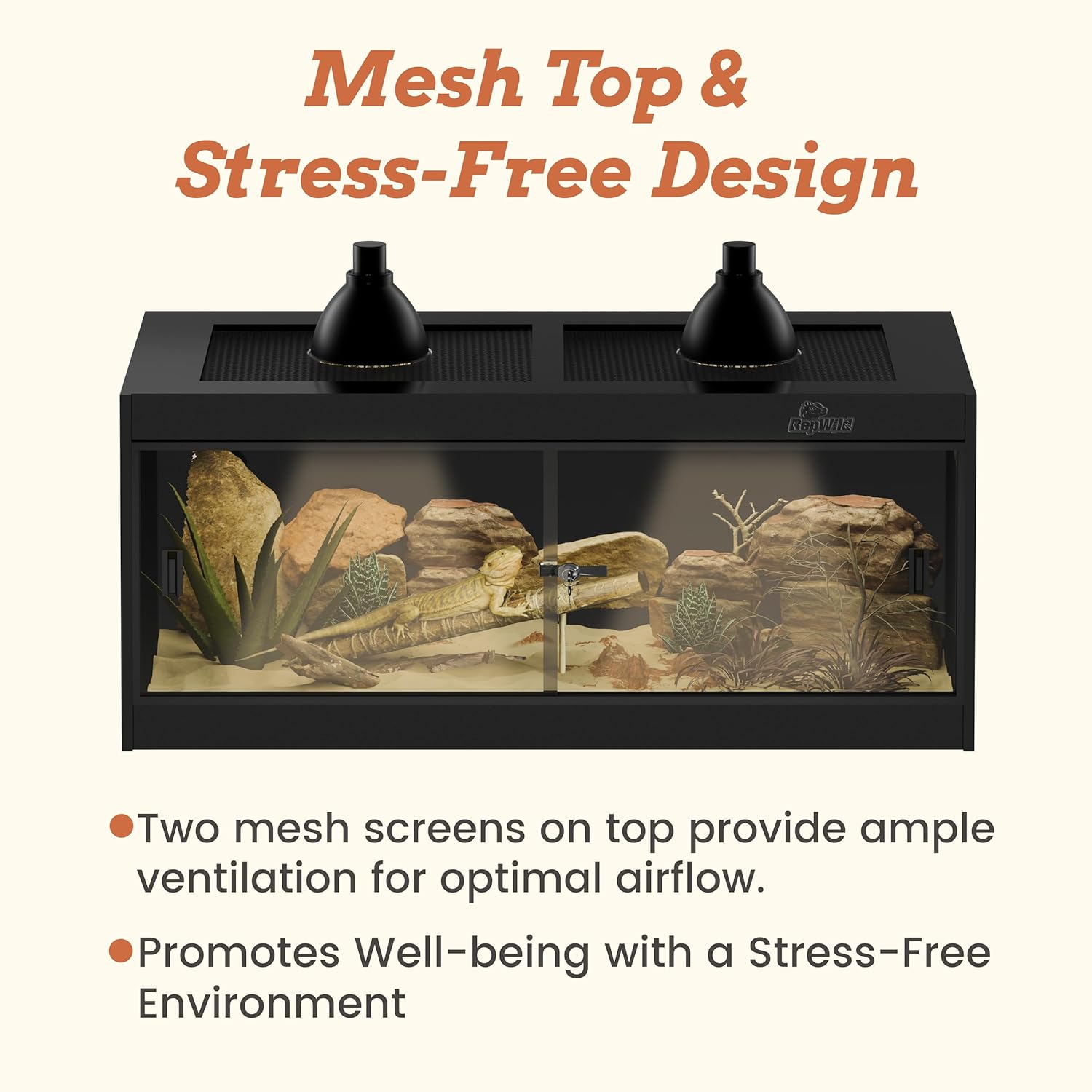 - 【Secure Glass Door & Ventilated Top】Features a front-opening tempered glass door with a lock and handle for easy access and security. The durable mesh top ensures excellent ventilation and allows UVB and heat penetration, creating a comfortable habitat for your pets.