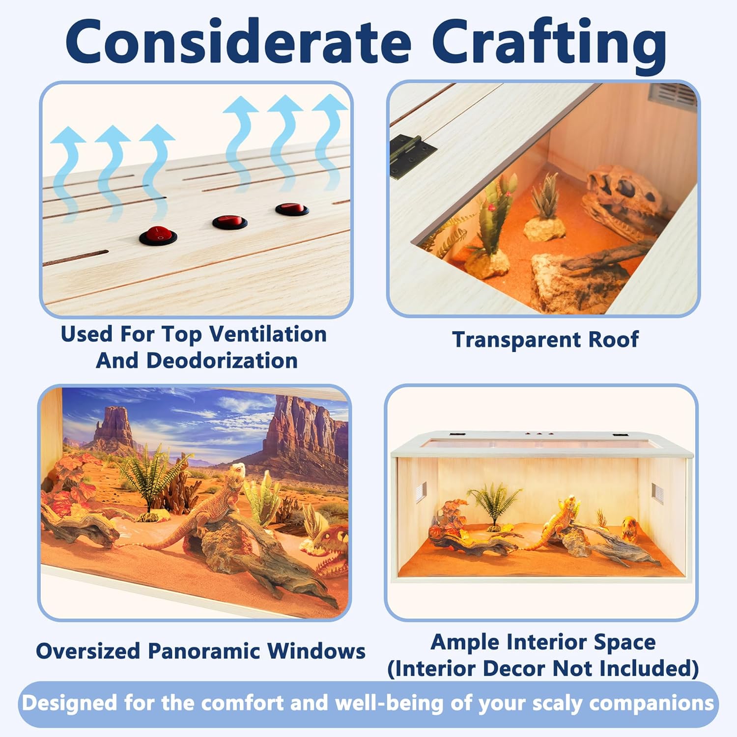 - 【Spacious Reptile Enclosure】Tailored for reptile lovers, this habitat provides ample space for reptiles to explore comfortably. Clear acrylic panels on the front and top allow for full visibility of your pet, while the ventilated top ensures adequate airflow. Note: This enclosure is not designed to hold water and comes in four size options.