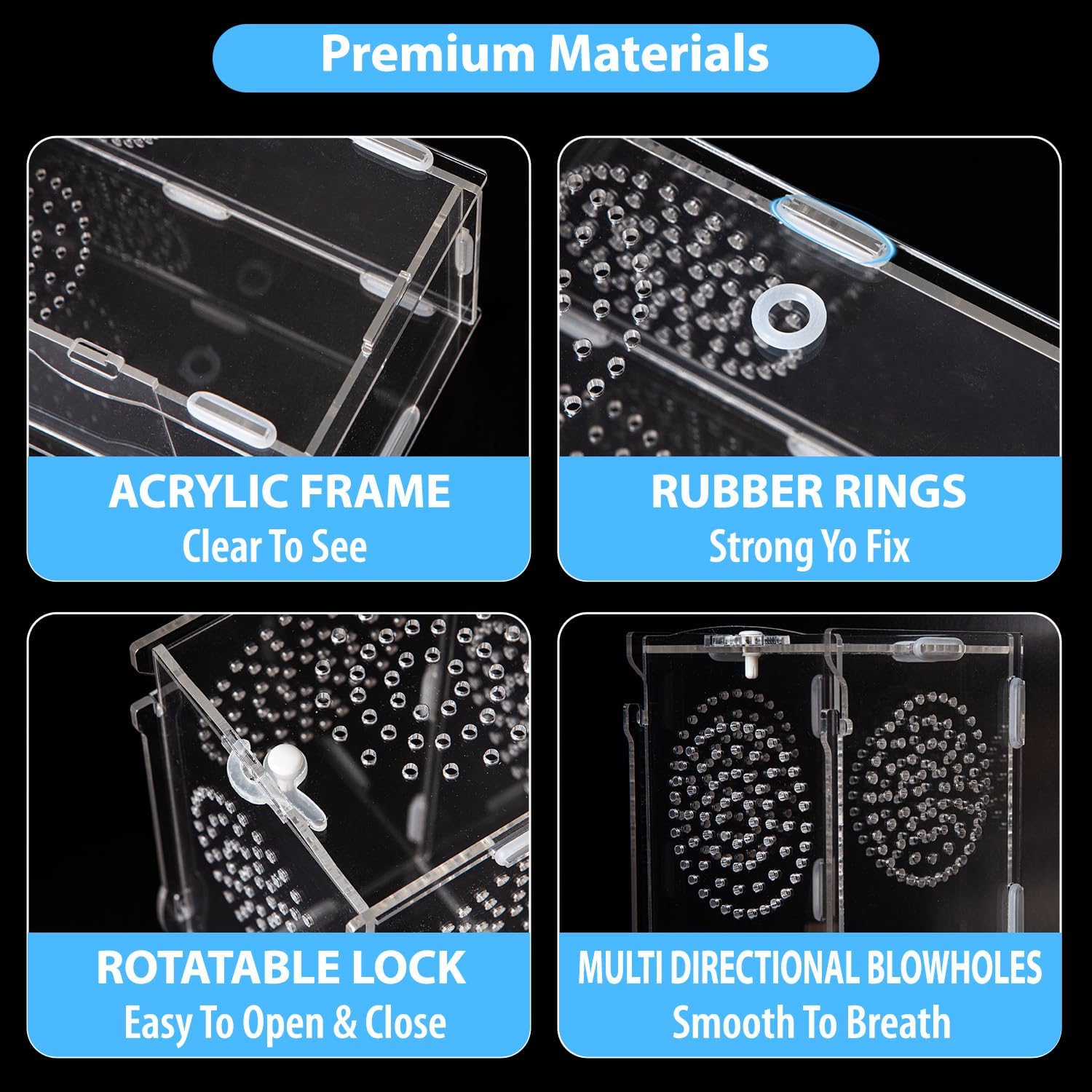 - 【 Premium Material and Safe】This reptile enclosure is crafted from high-quality acrylic plastic, reliable and sturdy to service for long time. High elasticity rubber rings can seal the whole cage well, and the double insurance of rotatable jailbreak lock on the top prevent pets from escaping