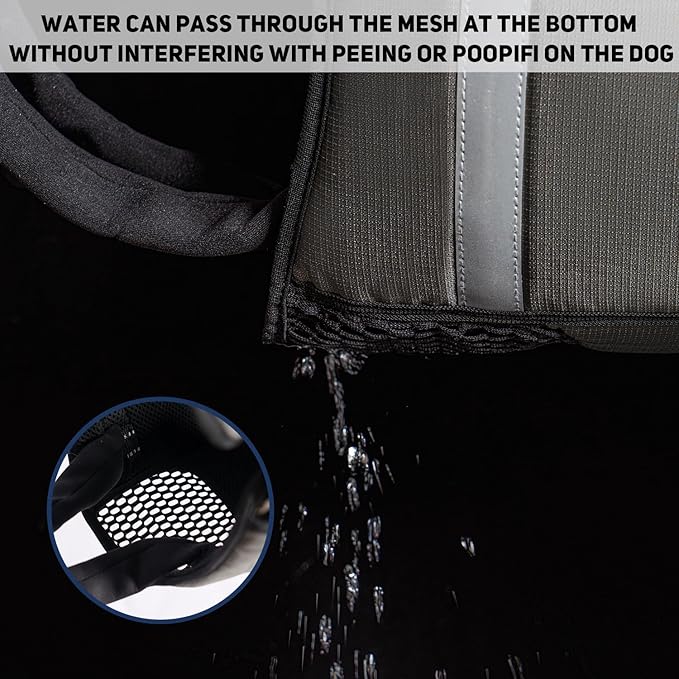 - 3. MESS-FREE DESIGN WITH VENTILATED URINE MESH Breathable mesh underbelly allows dogs to relieve themselves without removing the harness. Quick-dry fabric prevents odor buildup.