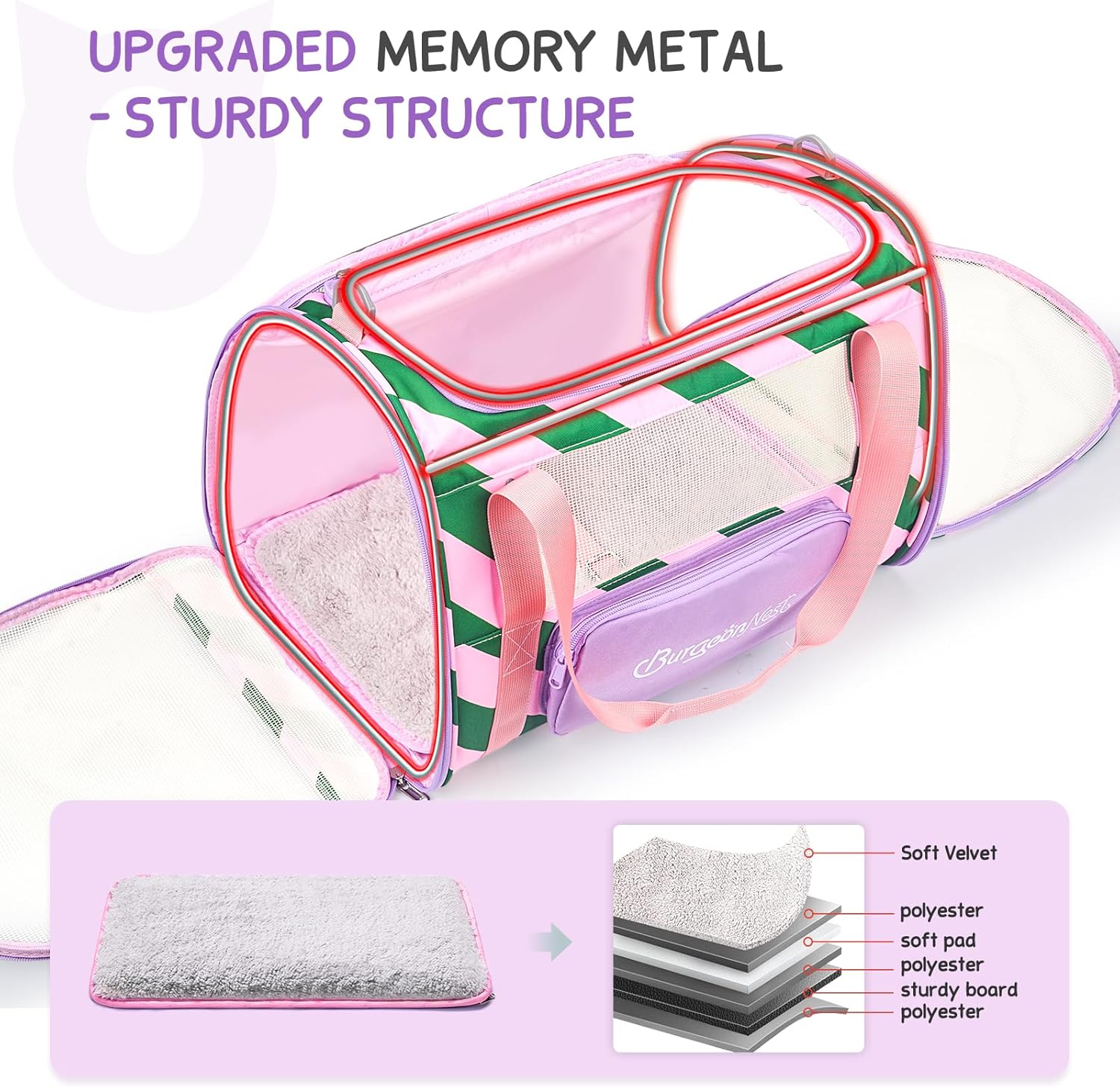 - Stable & Safe Frame: With upgraded memory metal for sturdy frame, this cat carrier for 2 cats does not collapse. Made of breathable fabric, BurgeonNest cat carrier has 3 doors to open, it is more convenient to put your dog cat in or out. Plush cushion with sturdy bottom inserts ensures comfortable environment for pets.