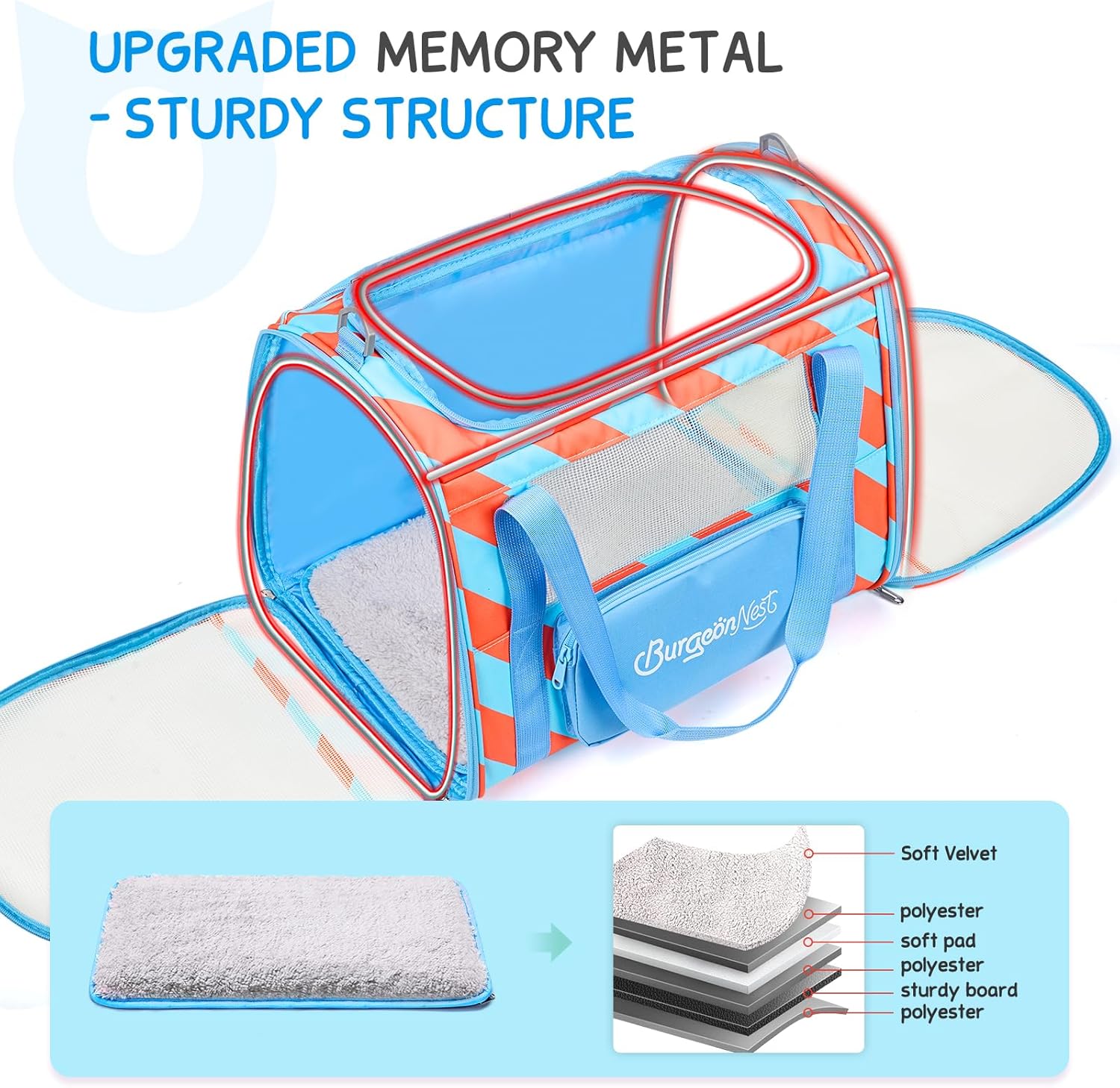 - Stable & Safe Frame: With upgraded memory metal for sturdy frame, this cat carrier for 2 cats does not collapse. Made of breathable fabric, BurgeonNest cat carrier has 3 doors to open, it is more convenient to put your dog cat in or out. Plush cushion with sturdy bottom inserts ensures comfortable environment for pets.