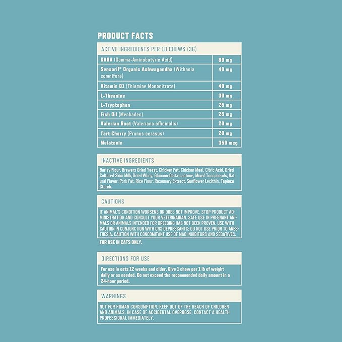 - Better Ingredients, Better Results: Our formula features premium calming ingredients like Sensoril Organic Ashwagandha and GABA, which help block stress signals in the brain to encourage relaxation and calmness; We’ve also included tryptophan, theanine, and the natural hormone melatonin, to enhance calming effects yet keep your cat alert