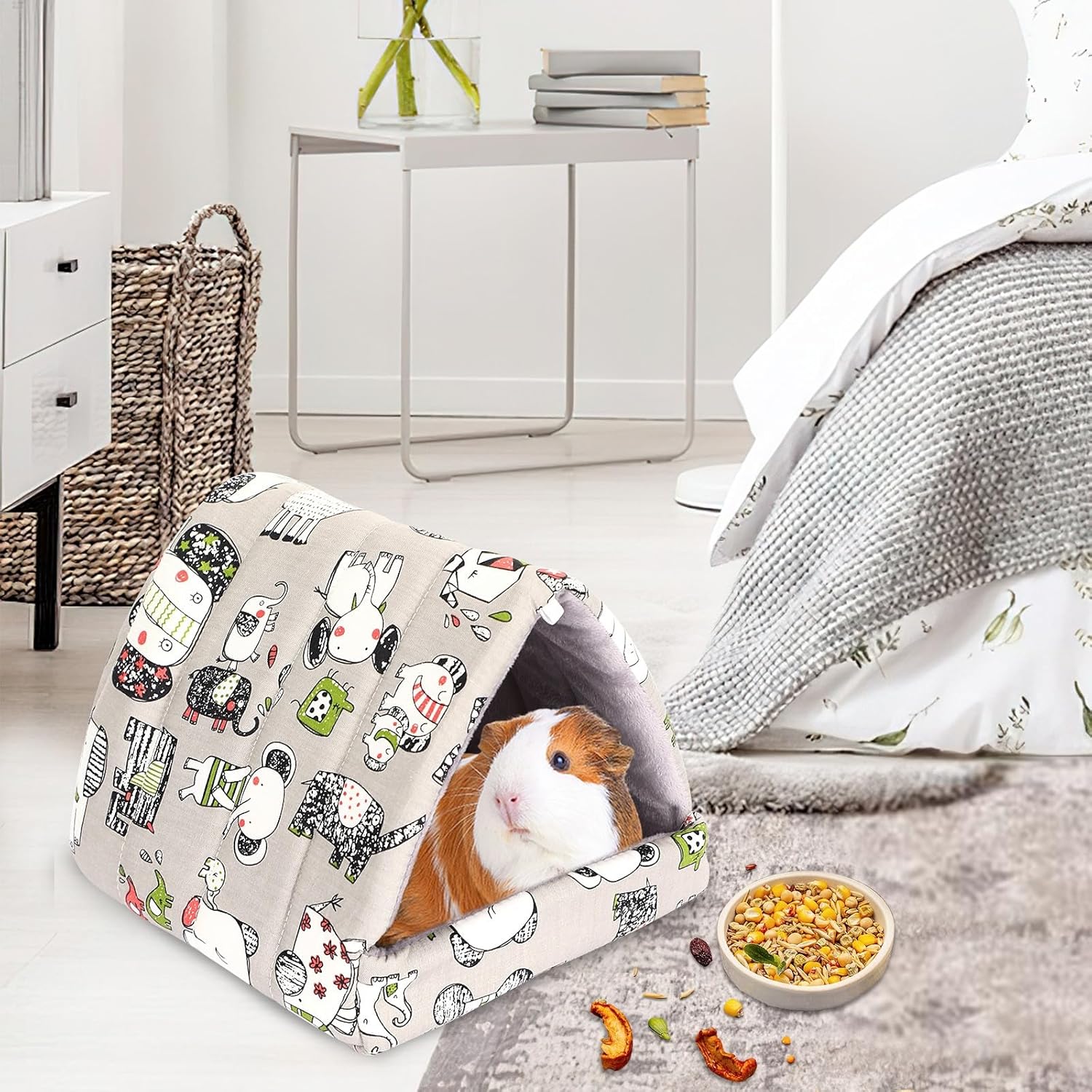 - Friendly Design: Adopting grey, the hamster nest is not easy to get dirty,very practical to use, with bright and beautiful patterns. The integrated design avoids accessories from slipping out and can also provide protection for the claws of small animals from being caught. The thickened inner cushion makes the Guinea pig bed stand upright and not easily deformed