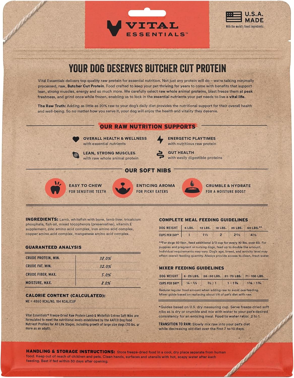 - SOFT NIBS FREEZE-DRIED RAW LAMB & WHITEFISH DOG FOOD: Vital Essentials Freeze Dried Soft Nibs Dog Food packs more protein than industry standard into every soft bite to deliver the peak vitality your dog deserves, especially when compared to dehydrated dog food. This complete and balanced freeze-dried raw dog food is made with responsibly sourced premium Butcher Cut lamb and whitefish.