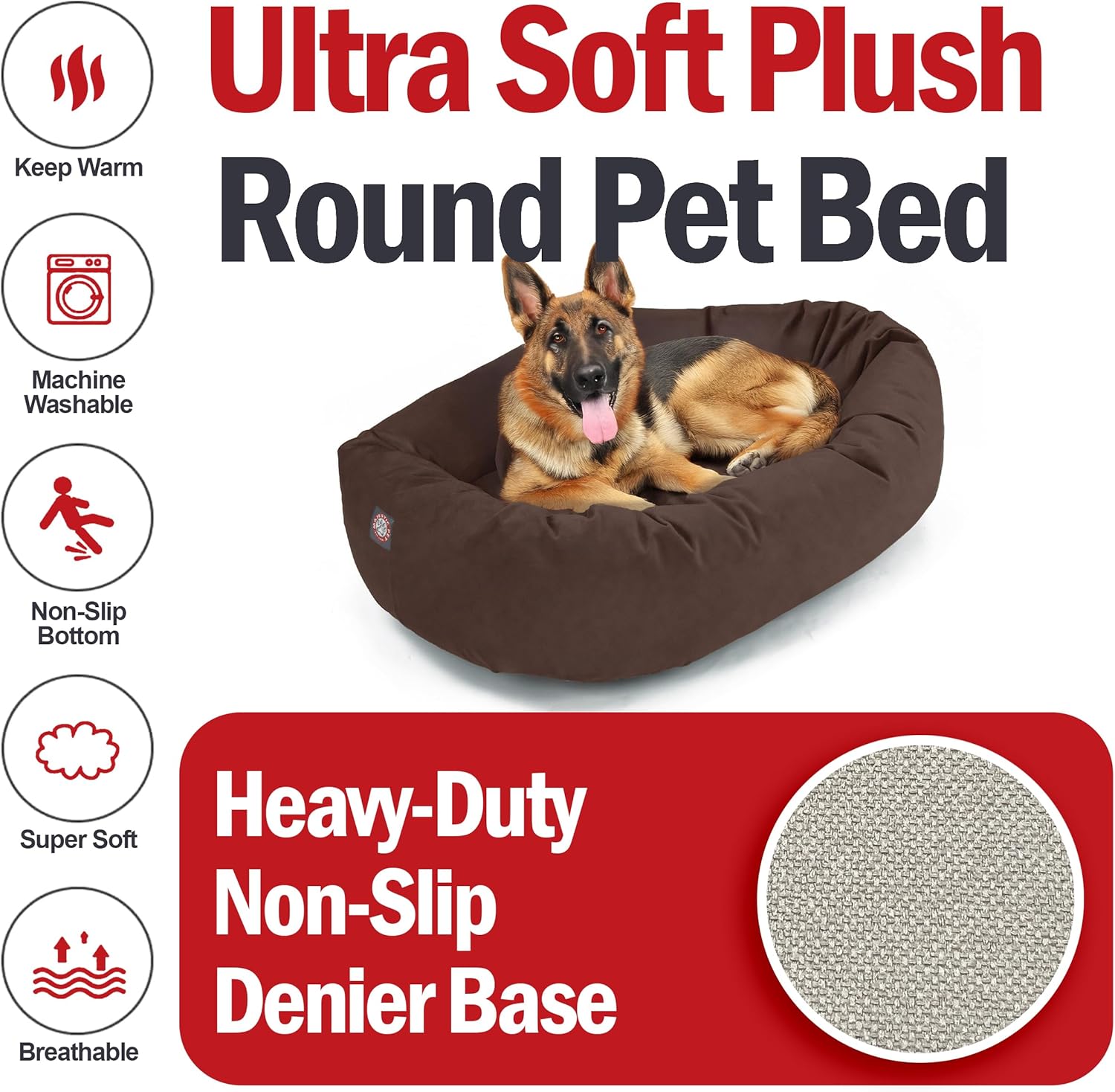 - [Elegance meets durability] - Crafted with premium high-loft polyester fill, the Majestic Pet dog bed offers a regal sleeping experience, lasting quality, and exceptional loft and coziness. The cushioned pillow adds an extra layer of comfort to pamper your pet. No more compromising on comfort, style, or ease of cleaning. Upgrade your pet's lifestyle today with our round dog bed.