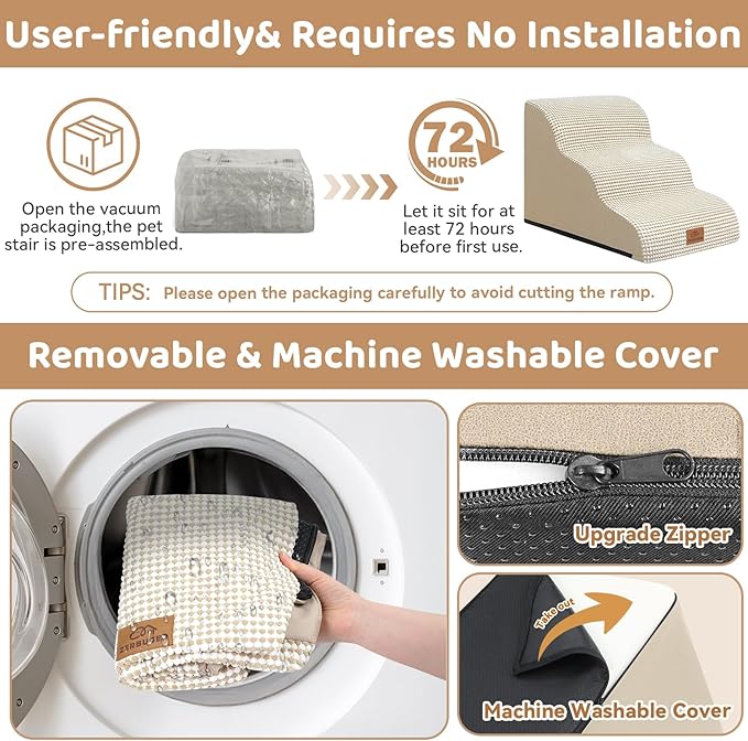 - No Assembly Required & Easy to Clean: When you open the packaging, the pet stair is already assembled. Before the first use, it should be left standing for at least 48-72 hours for the foam to fully expand. NOTE!! Open the packaging carefully to avoid cutting the stair! The outer cover can be removed for cleaning and supports machine washing or hand washing. Please note that the inner foam is not washable.