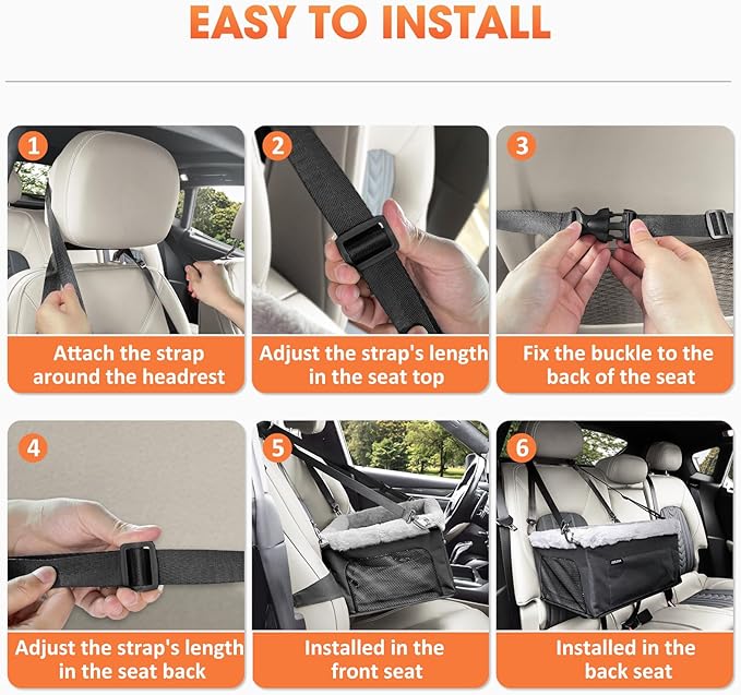 - 🐶[Easy to Install]: With its adjustable buckle design, the car seat for dogs can be easily installed. Simply attach the two straps around the headrest, fix the buckle to the back of the seat, and adjust the strap length as needed. It can be installed in both the front and back seats of your car, and it is compatible with most types of car seats and car models.