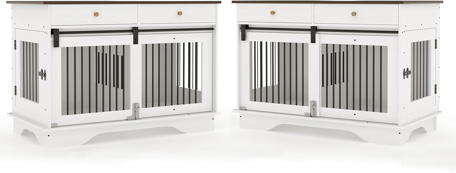 Dog Furniture Crate, 47" Large Dog Crate Furniture w/ 2 Storage Draws & Removable Divider for Large/Medium/Small Dogs (White, Double Cage)