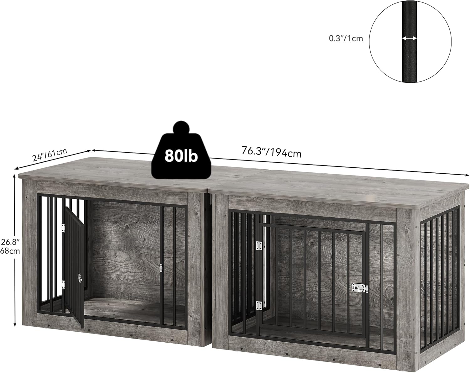 YITAHOME 76 Inch Double Dog Crate Furniture, XXL Dog Crate Furniture for 2 Dogs, Side End Table, Waterproof Top, Safety Corners, 2-in-1 Iron-Wood Fusion Dog Kennel Furniture for 2 Large Dogs,Greige