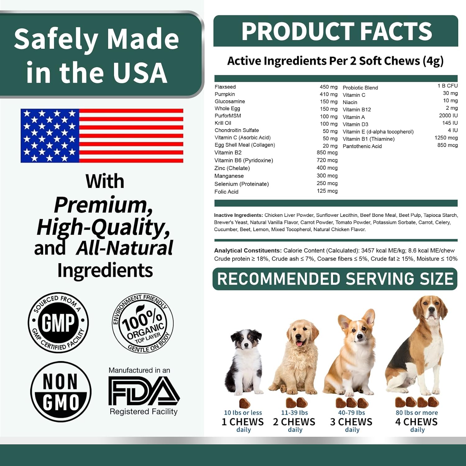 - Boosts Immunity & Heart Health – A potent blend of Vitamins A, C, and D3, known for their anti-inflammatory and antioxidant properties, supports a robust immune system and cardiovascular health. Plus, the delicious soft chews make it easy to give your dog the care they deserve.