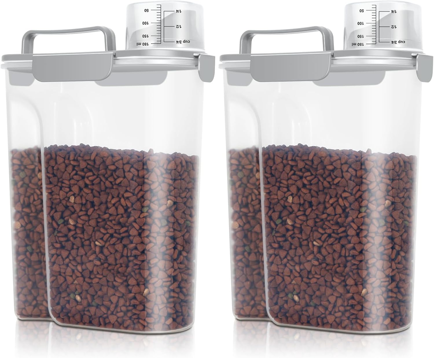- Large Pet Food Container Set: TBMax dog food storage containers come with two 6-qt bins that each one can hold about a 5 to 7 lbs bag of dry dog food or cat food, which depending on the particles of the pet food. Ideal for storing small pet food like kitten puppy kibble, bird seeds, fish food and more