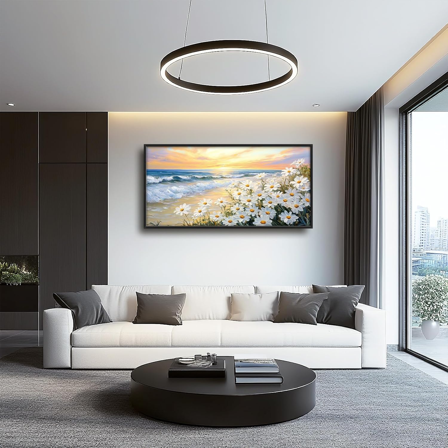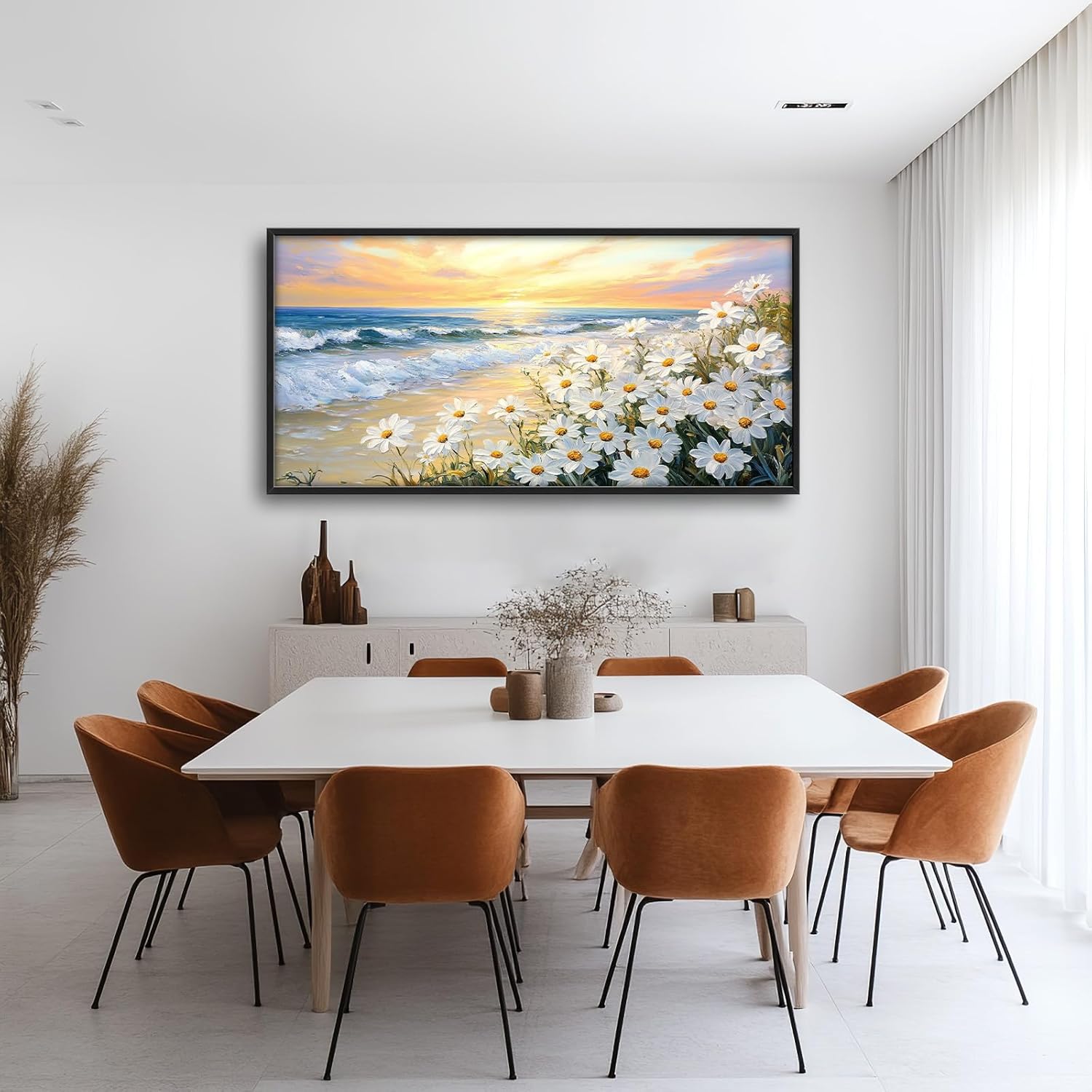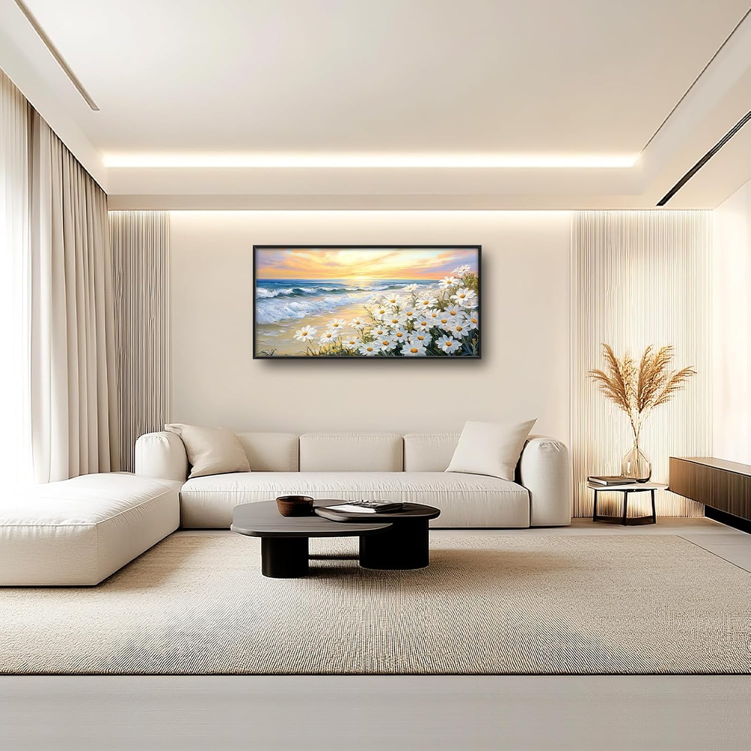 Large Beach Daisy Wall Art, Framed Coastal Beach Wall Decor for Living Room, Oversized Sunrise Canvas Painting Seascape Pictures Home Decoration for Living Room Bedroom Office 60"x30"