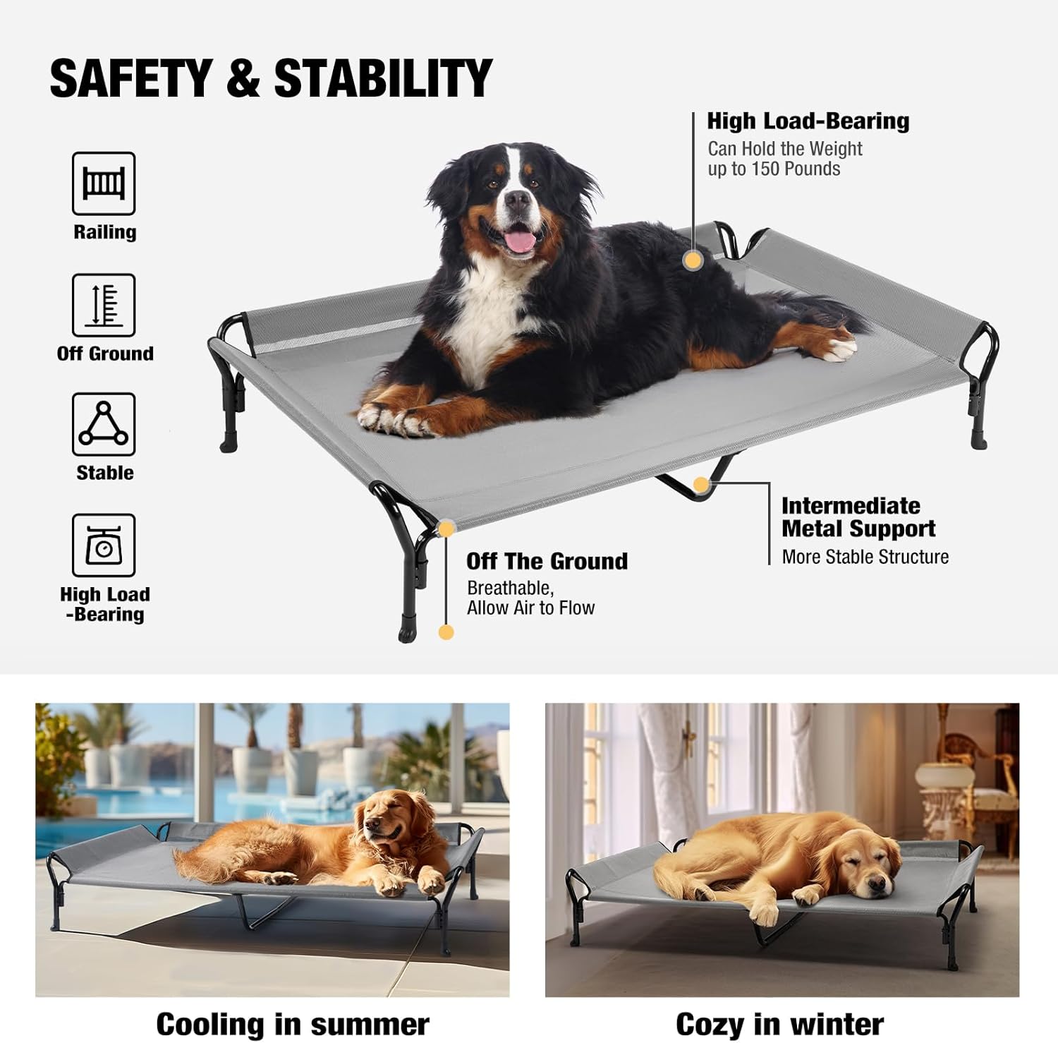 - All-Season Comfort: The Teslin Mesh mat not only allows the air to flow, but also allows the water to penetrate, keeping your pet cool in summer; The elevated dog bed lifts your dog 8.2 inches off the hard ground, mud or wet grass, alleviating joints pressure and keeping health