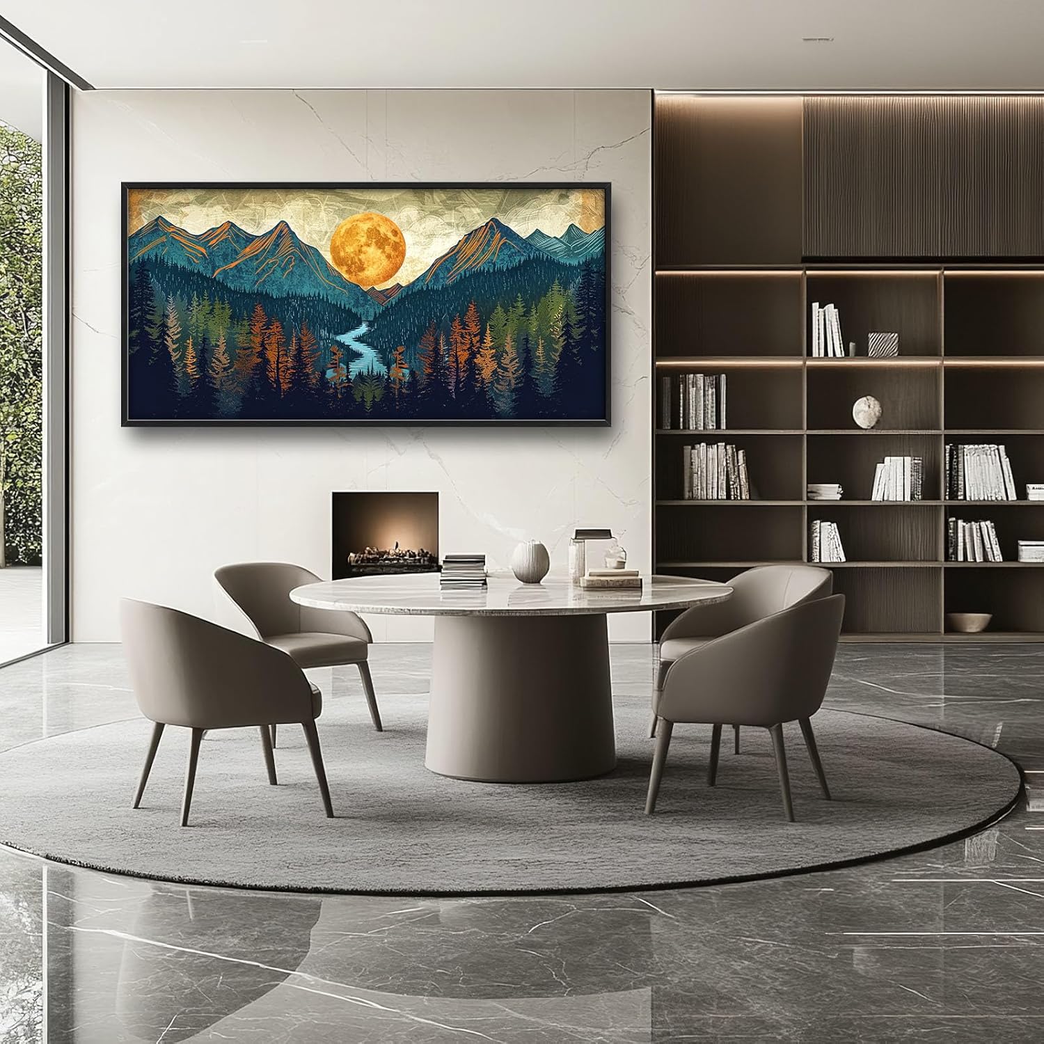 - 【Unique Design】An artwork of mountains and forests with the moon rising between them. Use muted earth tones, a forest green color for the trees, and a deep blue to depict the water flowing through the valley. The sky should have shades of grey or brown, with golden hues from the sunset casting on the mountain peaks. In the center is a large, orange sun shining over everything.