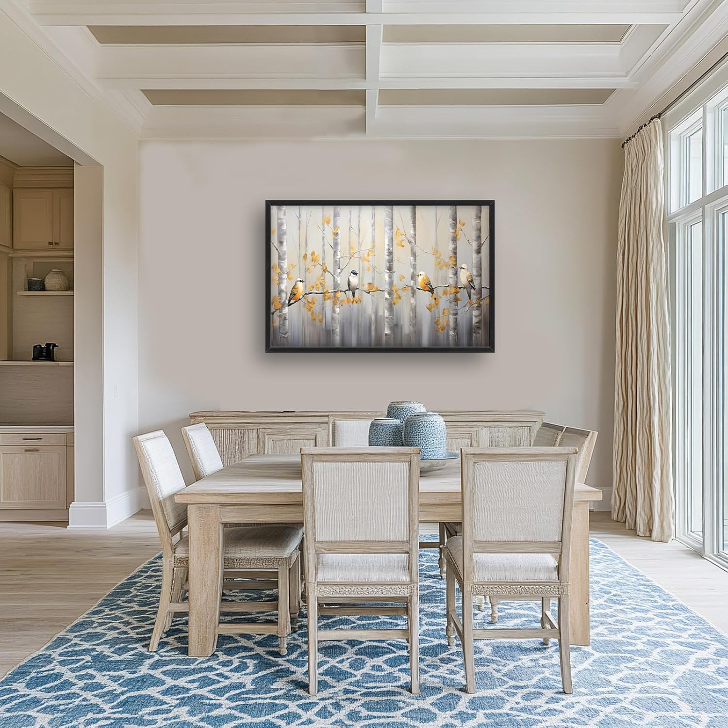 - 【Unique Design】Abstract painting of silver birch trees with birds, yellow leaves, white background, gold accents, soft lighting, neutral tones, modern style, wide frame, oil on canvas, brush strokes, elegant composition, nature-inspired artwork.
