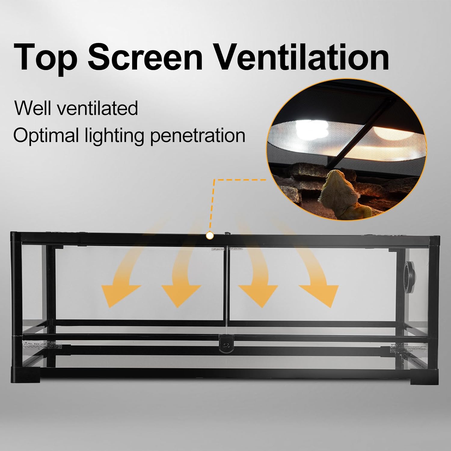 - Ventilated Screen Top with Security buckle: Mesh top ensures optimal airflow and ventilation crucial for reptile health. Support various lighting fixtures (heat lamp, UVB, basking lamps). Security buckle on the lid ensure the tank closed tightly, prevent your reptile from escaping
