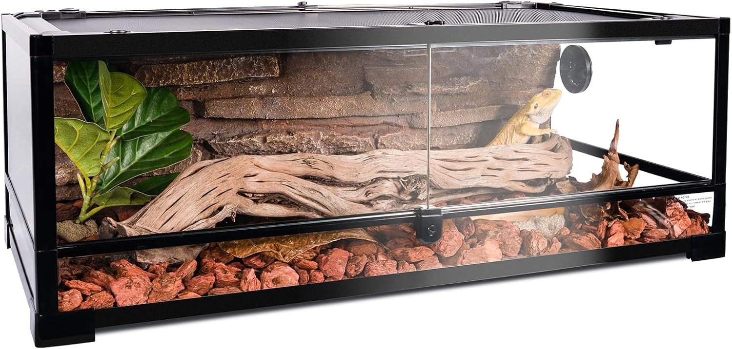 - Premium & Durable Construction: Featuring tempered glass on all four sides and aluminum alloy frame, iron mesh top, this terrarium delivers exceptional durability. Provides crystal-clear, uninterrupted viewing from every angle – an essential component for reptile habitat