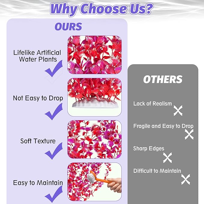 - RELIABLE MATERIAL : Our fake water plant leaves and roots are made of soft plastic material that won't affect the water quality. The leaves do not have sharp edges and have a soft texture, which can effectively avoid any physical damage to the fish while swimming or playing, and can better beautify the e-nvironment, maintain stability and not fade. Provide a comfortable and clean living e-nvironment for fish. Whether placed in a saltwater e-nvironment or freshwater e-nvironment, it can be perfectly adapted