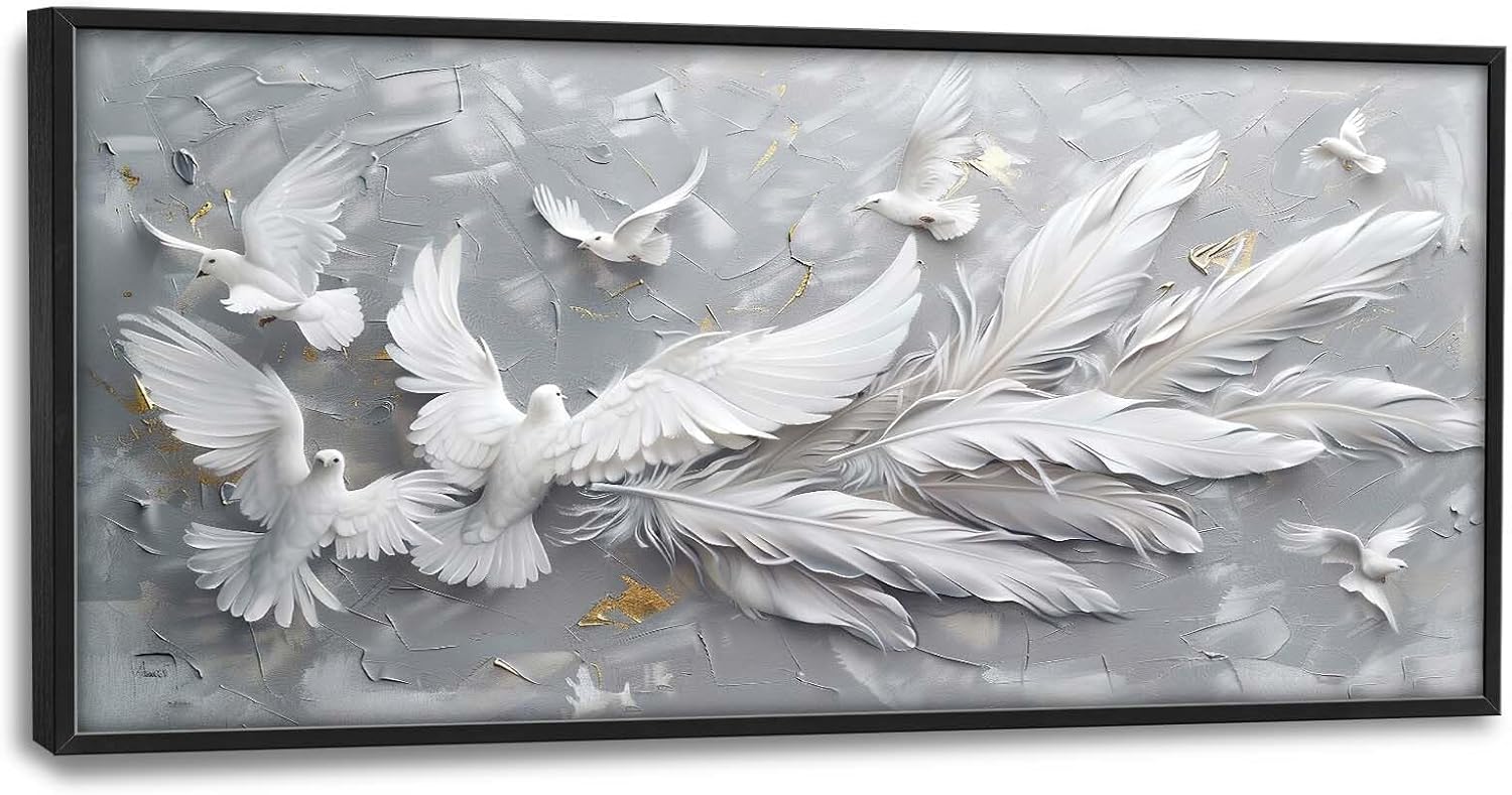 Quorin Feather Dove Bird Large Wall Art White Gray Holy Wings Pictures Peaceful Birds Flying Wall Decor Canvas Print Painting Artwork for Bathroom Living Room Bedroom 60L x 30W
