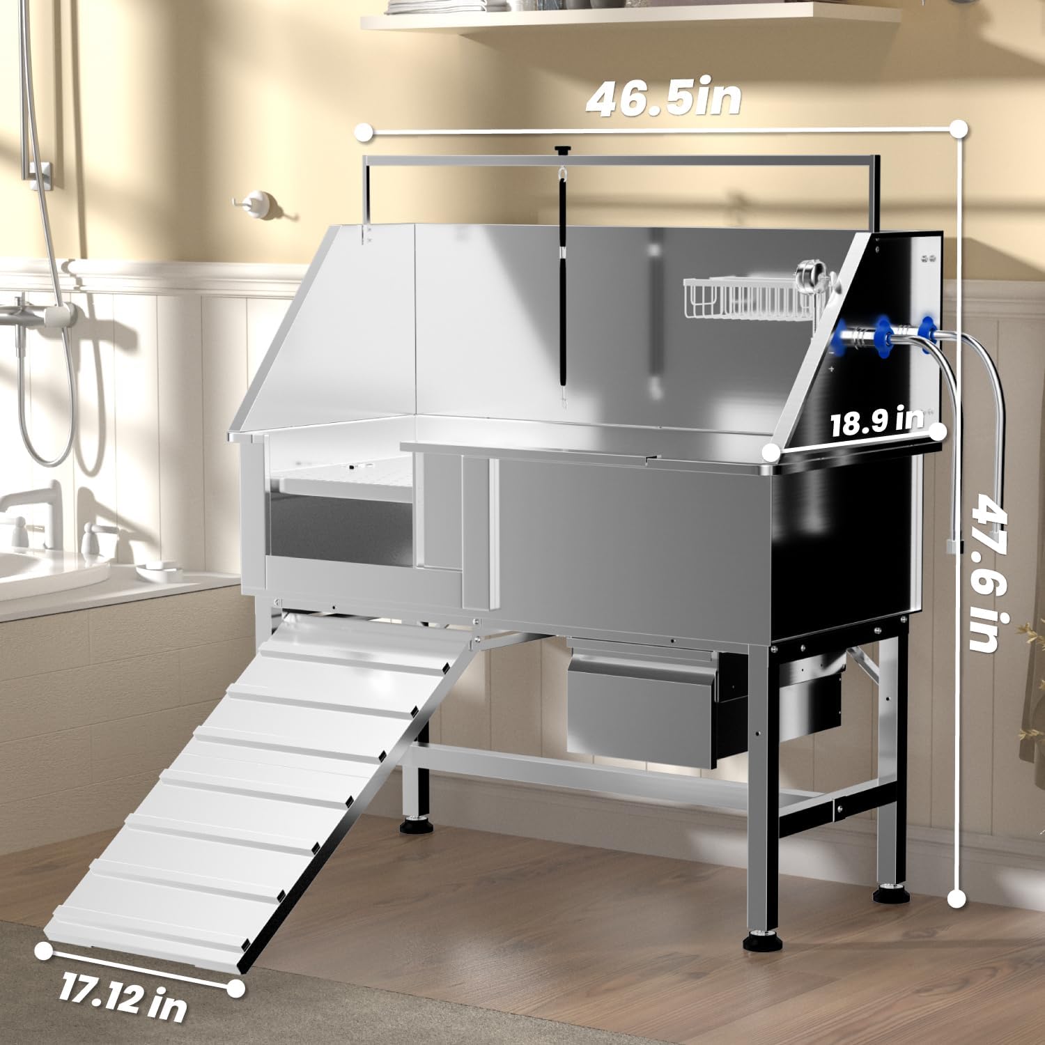 Professional 46" Dog Washing Station, Stainless Steel Dog Bathing Station, Height Adjustable Dog Wash Station, Storage Drawer, Upgrade Parts, Home, Commercial (Left Ramp)