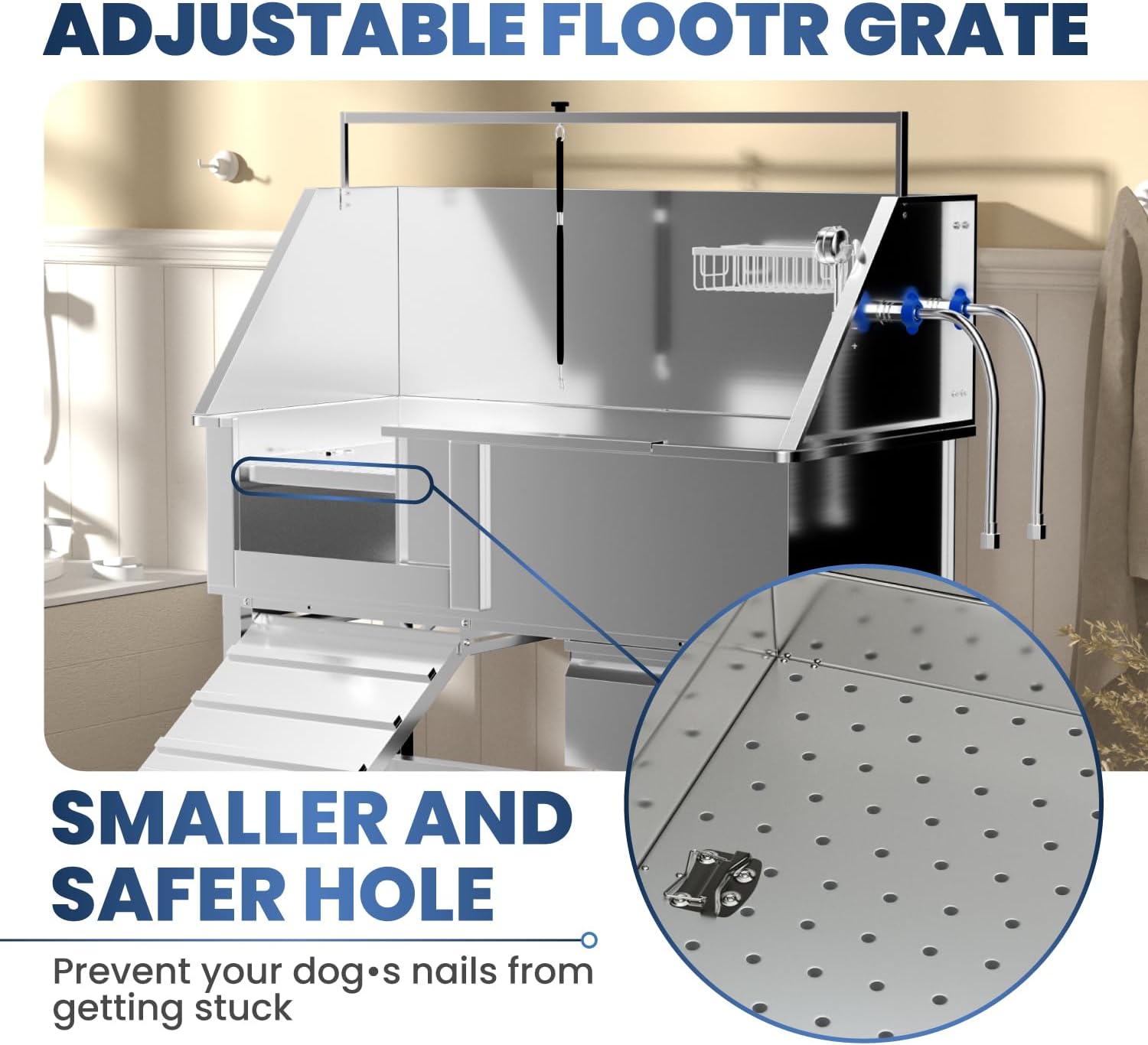 - Tzechkii dog bathtub features adjustable legs, making it suitable for most owners of various heights and helping to prevent back pain from bending over for long periods. Additionally, the movable, adjustable panel in the dog grooming tub can be positioned to accommodate dogs of different sizes, ensuring a comfortable and efficient bathing experience for both you and your pet